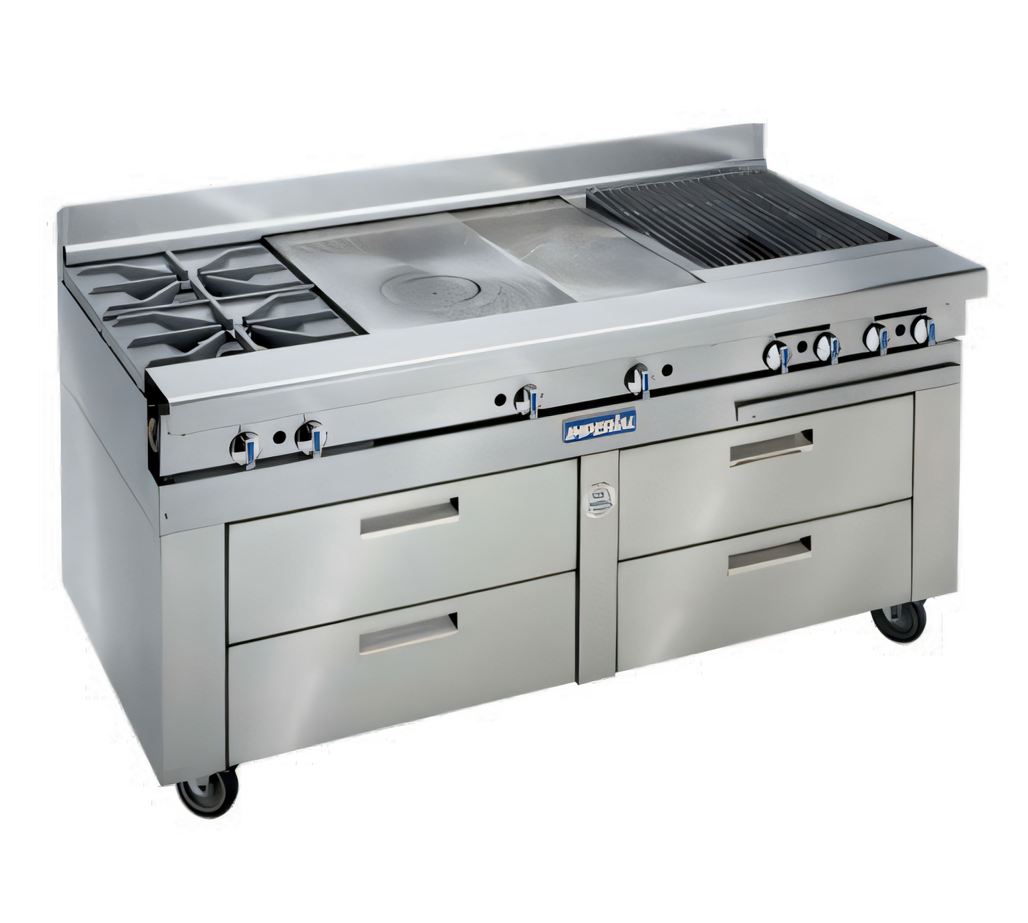 Model IHR-XX-RM-72 | 8 Full-Size Pan CapacityBring refrigerated storage right to the cookline. Imperial’s heavy-duty Spec Series “Sizzle ‘N Chill” base keeps ingredients at food-safe temperatures in the same footprint that supports your rangetop, griddle or broiler—boosting speed, safety and workflow in any high-volume kitchen.