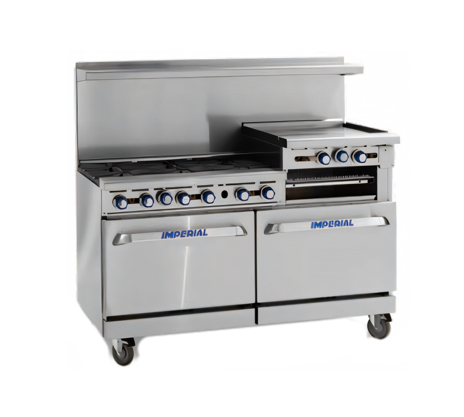 Model IR-G60 | 170,000 BTU (50 kW)Built for high-volume kitchens, the Imperial Pro Series IR-G60 combines a full-width 60" griddle with two spacious Chef-Depth ovens—delivering the power, durability, and ease of cleaning demanded by busy diners, cafés, and institutions.