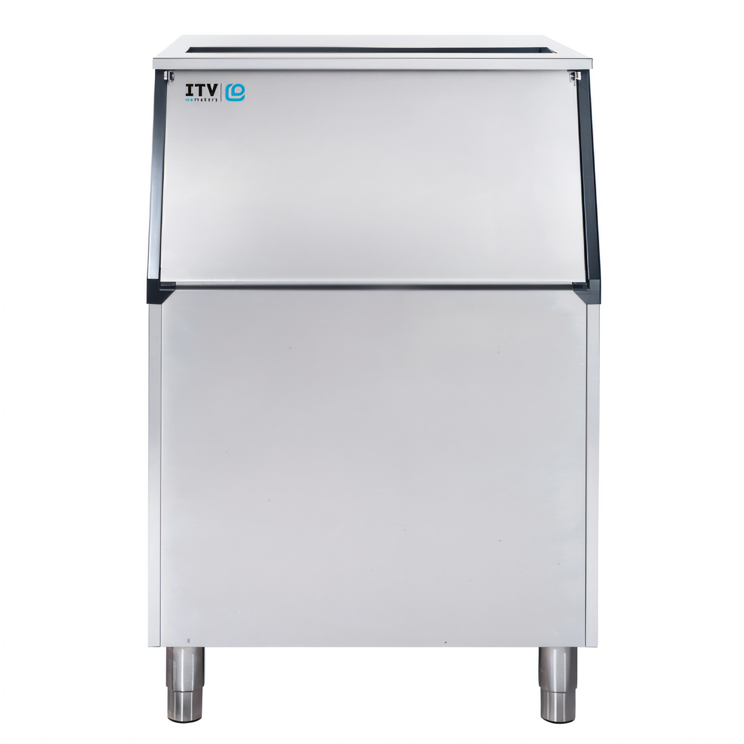 ITV S-300 ice bin: 282 lb stainless slope-front storage, 304 SS front/sides, galvanized back/bottom, NSF certified, adjustable legs.
