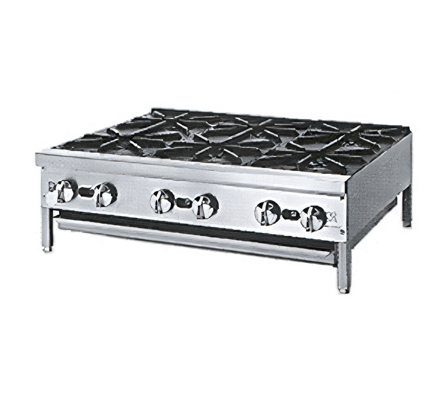Supreme™ Hotplate, countertop, gas, 36", (6) 27,500 BTU burners, infinite manual controls, pilot tips, drip tray, stainless steel sides, front and plate shelf, 4" adjustable stainless steel legs, 165,000 BTU, CSAus, NSF
