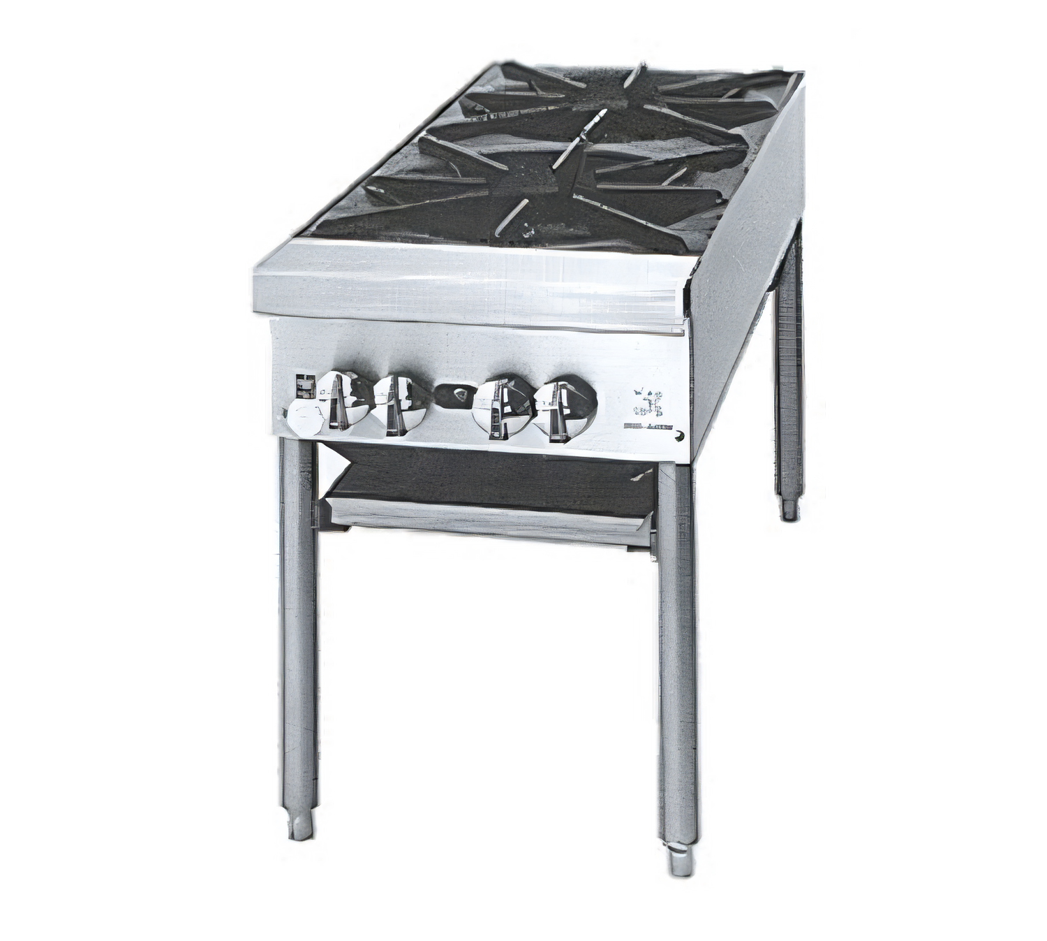 Supreme™ Stock Pot Stove, 18", (2) two ring burners, one burner in the front and one burner in the rear, reversible cast iron top grates for wok or candy bowls, infinite manual control per ring, standing pilot, stainless steel front & plate shelf, tubular legs with adjustable feet, 90,000 BTU, CSAus, NSF