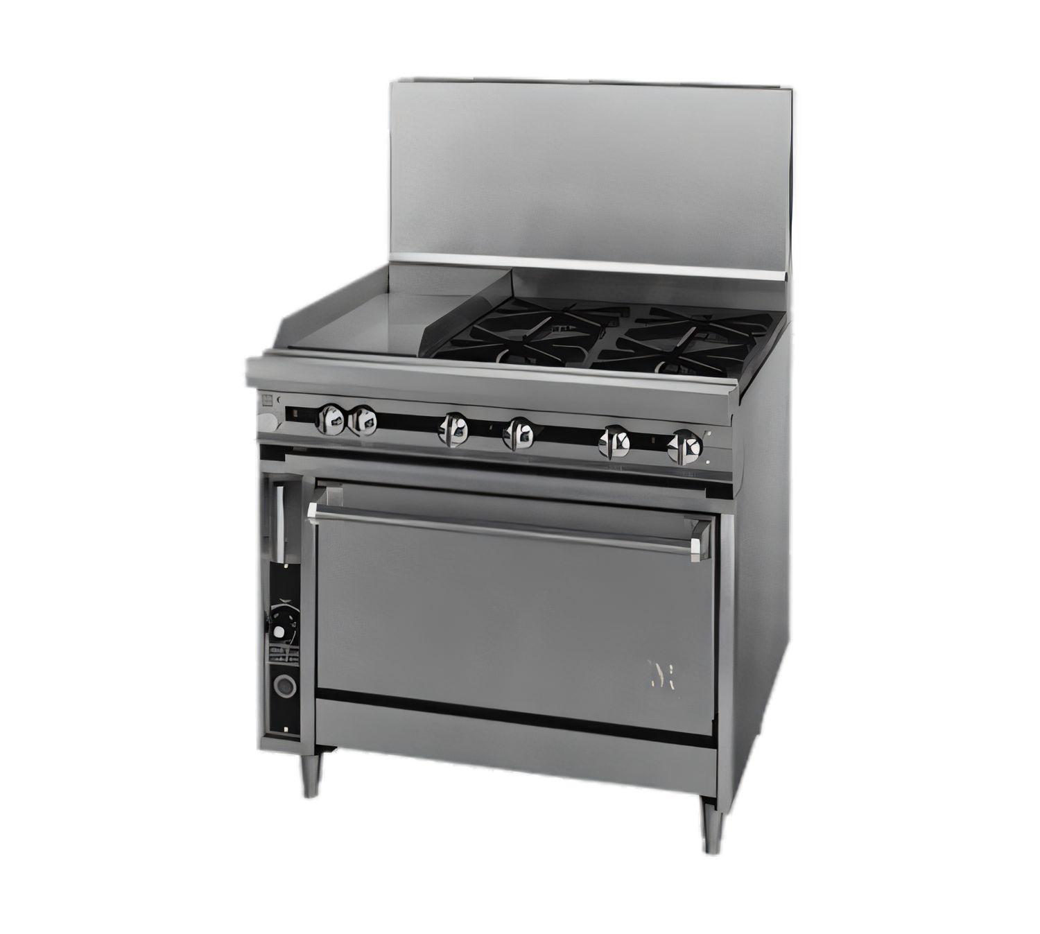 Titan™ Heavy Duty Range, gas, 36", (2) 12" open burners, (1) 24" griddle, manual controls (NO TEMPERATURE THERMOSTAT), convection oven, (2) chrome plated racks, stainless steel splashguards, oven liner, 6" plate shelf, front, sides, stub back & tray bed, 6" adjustable legs, 115v/60/1-ph, 4.4 amps, 1/4 HP, 130,000 BTU, CSAus, NSF