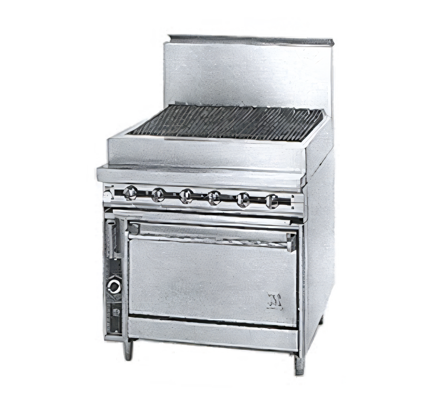 Titan™ Heavy Duty Range, gas, 36", charbroiler, cast iron burner radiants & top grates, infinite manual controls, standard oven, (2) chrome plated racks, (2) drip trays, stainless steel oven liner, 6" plate shelf, front, top, sides, stub back & tray bed, 6" adjustable legs, 125,000 BTU, CSAus, NSF