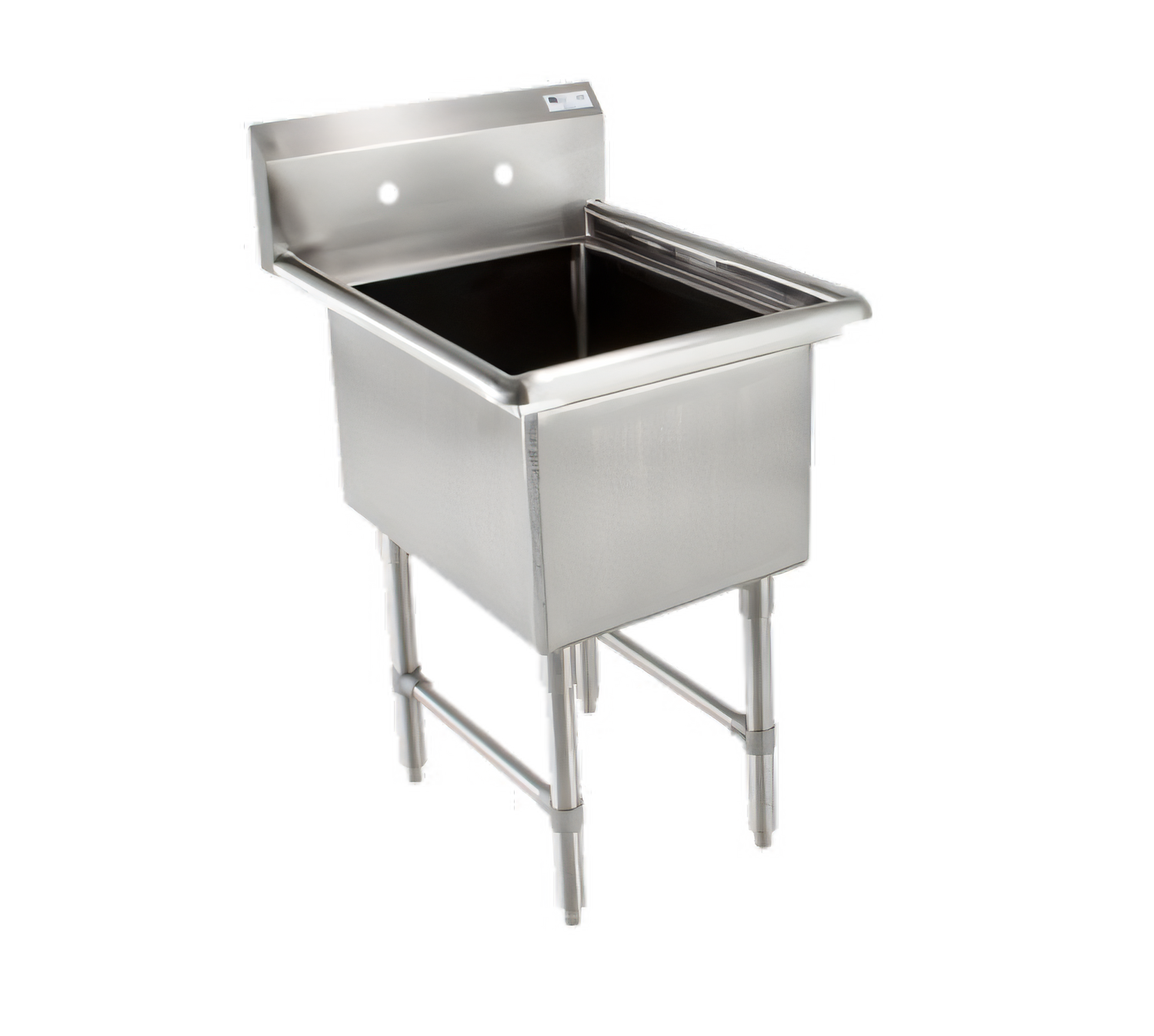 "B" Series Sink, 1-compartment, 23"W x 23-1/2"D x 44"H overall size, (1) 18"W x 18" front-to-back x 14" deep compartment, 10"H boxed backsplash with 45° top and 2" return, (1) set of splash mount faucet holes with 8" centers, 3-1/2" die-stamped drain opening, 16/300 stainless steel construction, stainless steel legs, adjustable side bracing, adjustable bullet feet, NSF, CSA-Sanitation (Available in Effingham and Nevada)