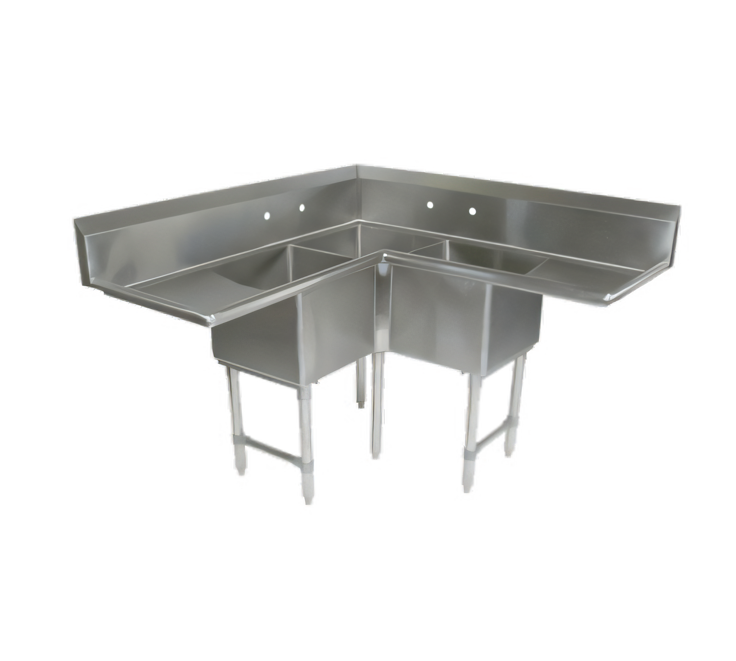 Model 3BCS-184-2D18 • NSF Certified 16 GA Type 300 Stainless SteelMaximize every inch of your dish room with this space-saving, L-shaped corner sink. Heavy-duty 16 gauge stainless steel, generous 18" drainboards, and NSF certification make it a reliable workhorse for high-volume kitchens, bars, and bakeries.