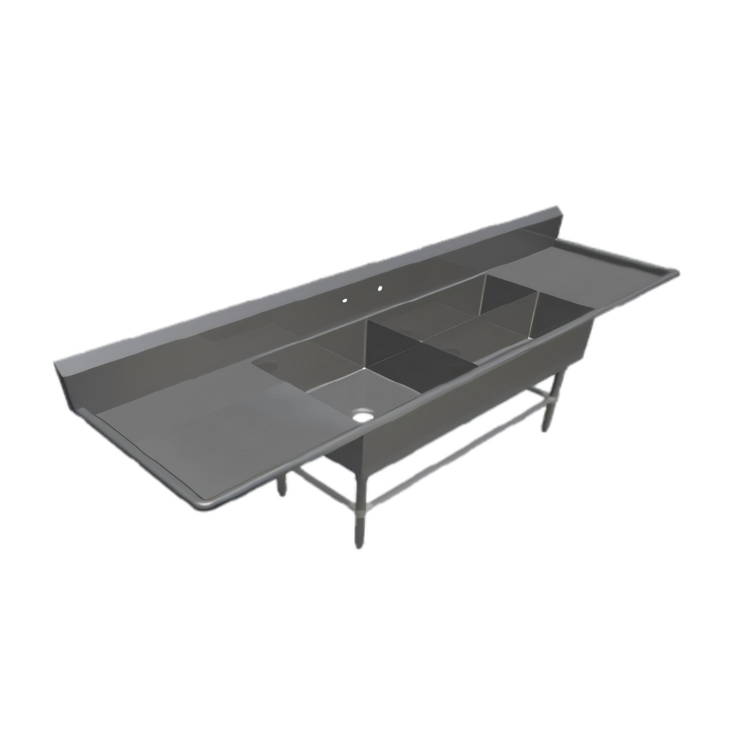 - Center bowl (24" × 24" × 12") is perfect for large pans; two flanking bowls (32" × 12" × 12") speed washing & rinsing.