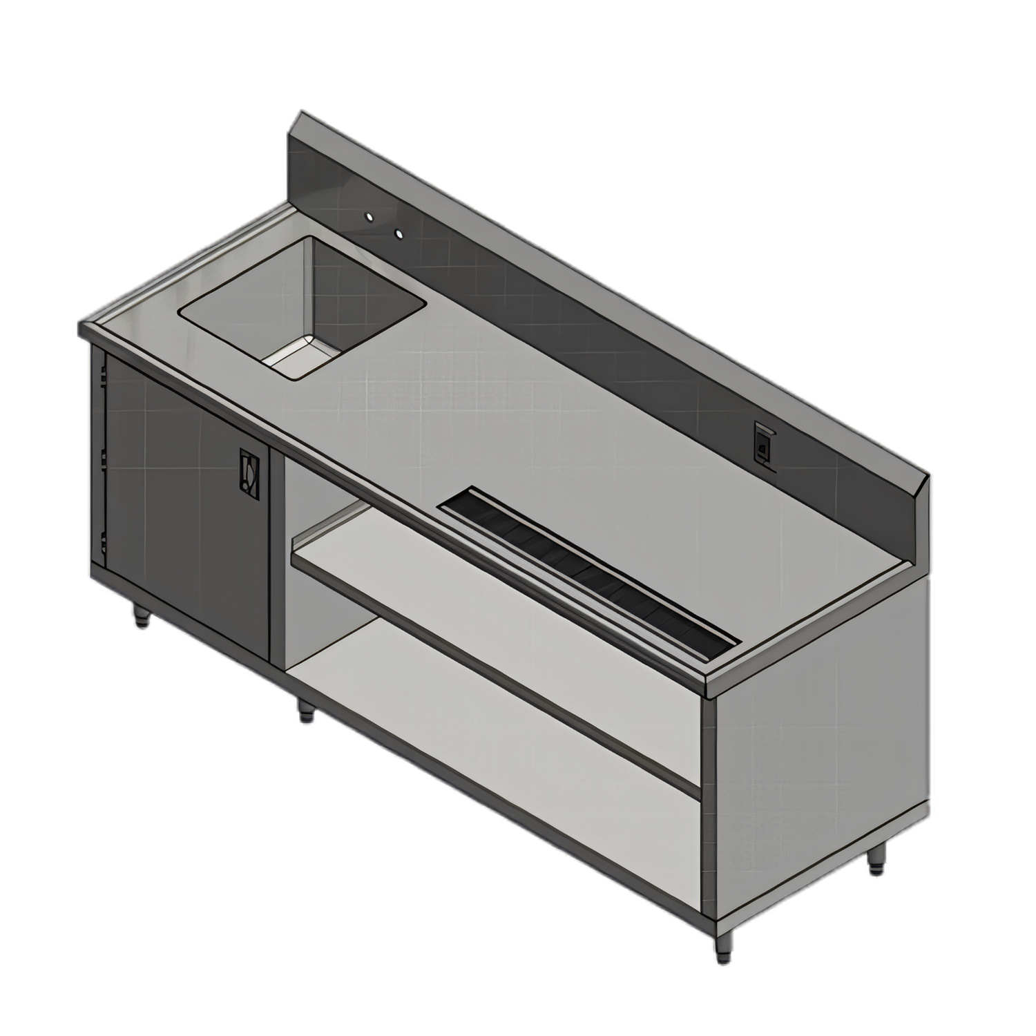 - Cabinet base with open front and a hinged door directly below the sink for chemical or waste storage.