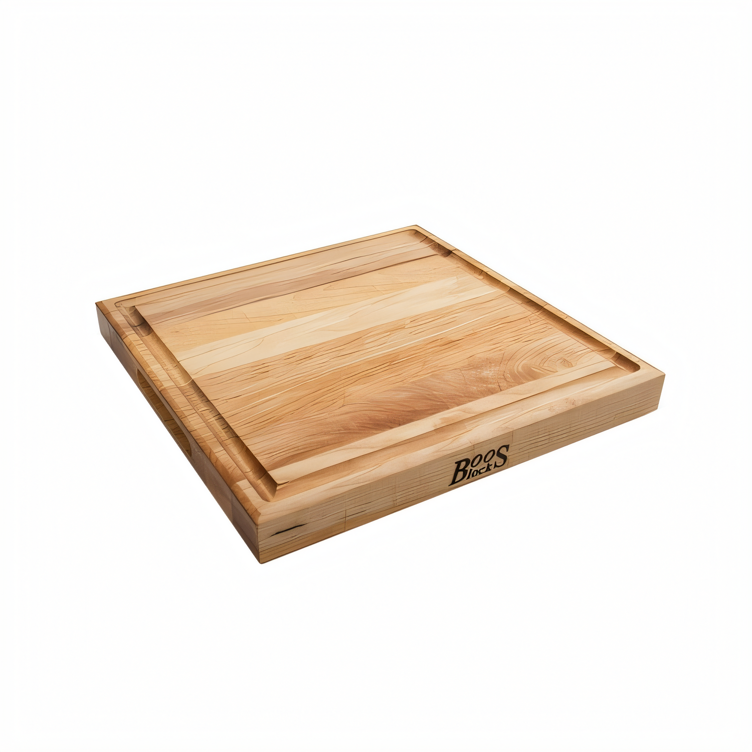 John Boos 15" square edge-grain maple cutting board, 1-3/4" thick, oil finish, reversible, juice groove, recessed grips—durable pro-grade kitchen board.