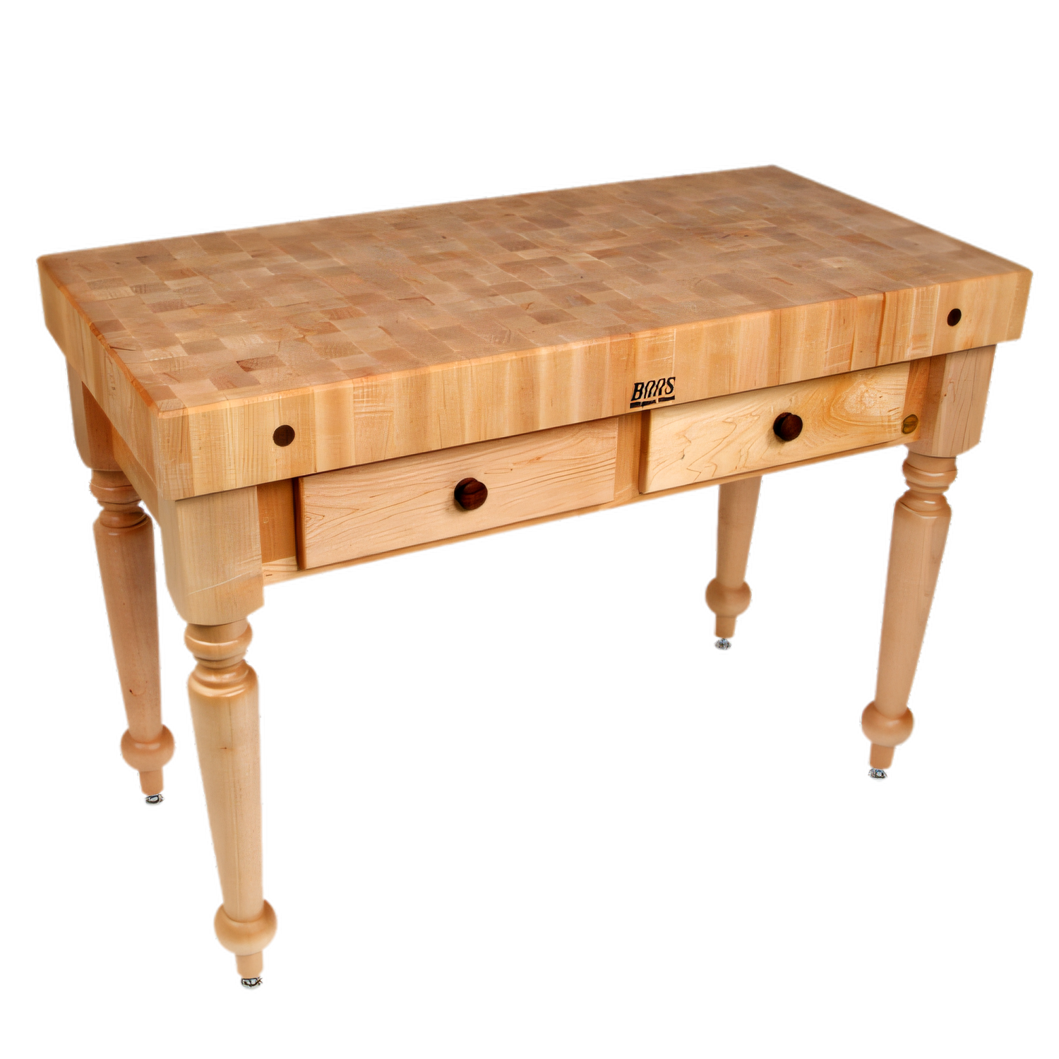 4" End-Grain Northern Hard Rock Maple • Dual Dovetailed DrawersBring professional-grade prep space and timeless farmhouse style to your kitchen with the Cucina Rustica butcher block table from the John Boos American Heritage Collection. Hand-crafted from sustainably harvested North American maple, this 4 inch thick end-grain top delivers unrivaled durability while showcasing the iconic Boos Block checkerboard pattern.