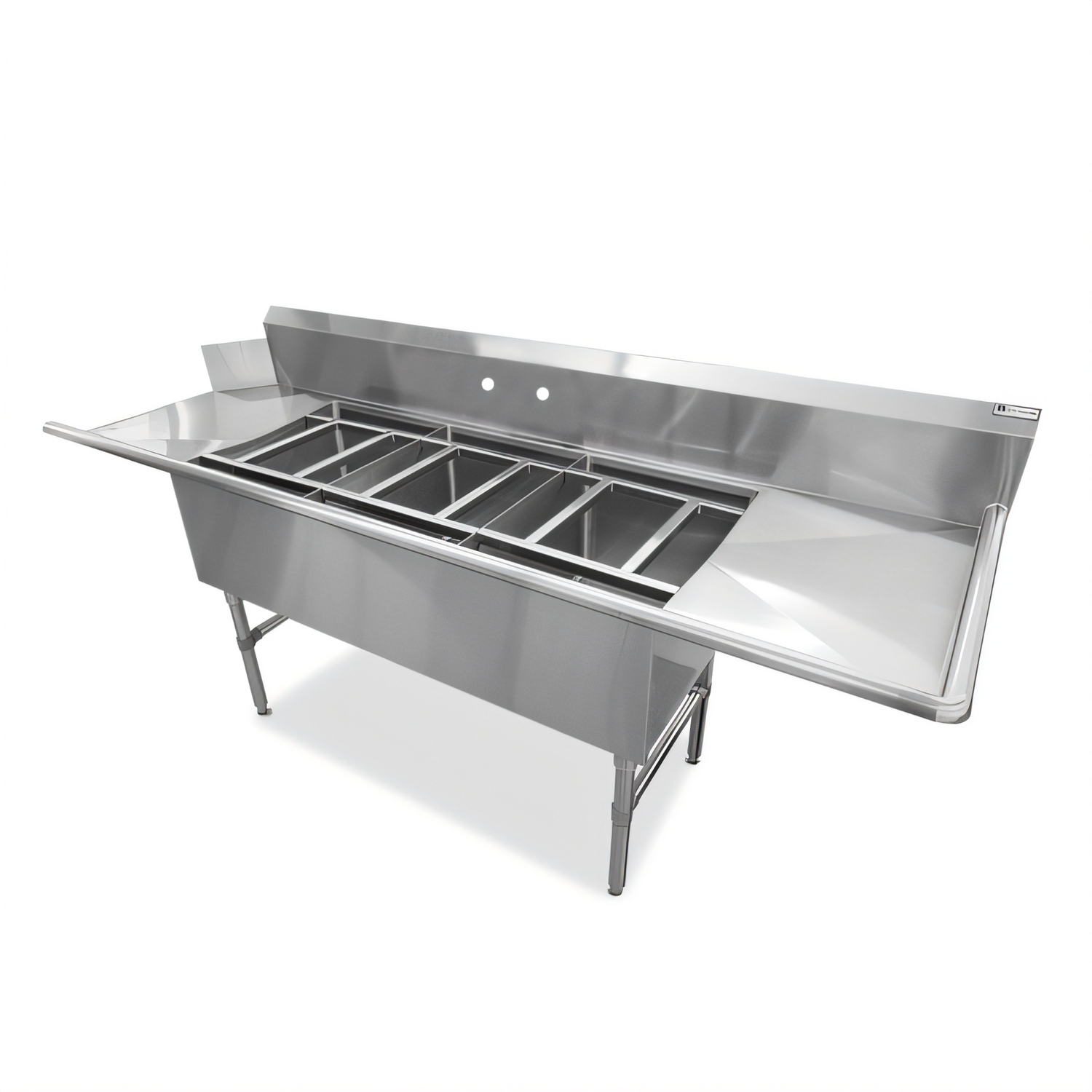 Why you’ll love it- Productive work flow – left-hand dishmachine cut-out feeds directly into three 18″ x 24″ x 14″ deep bowls for continuous cleaning, rinsing, and sanitizing.