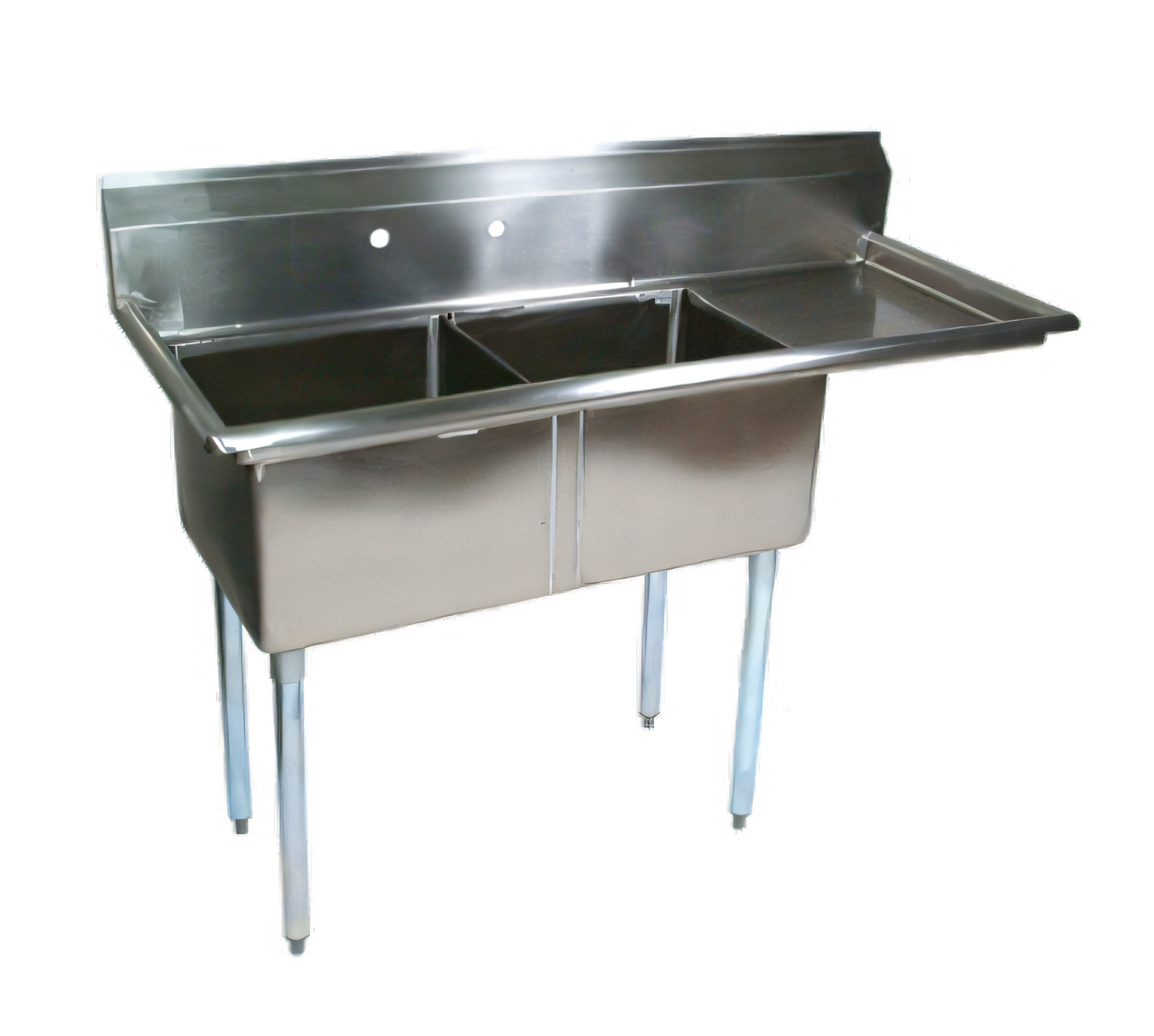 E-Series Sink, 2-compartment, 56-1/2"W x 23-1/2"D x 43-3/4"H overall size, (2) 18"W x 18" front-to-back x 12" deep compartments, (1) 18" right drainboard, 9-3/4"H boxed backsplash with 45° top and 2" return, (1) set of splash mount faucet holes with 8" centers, 3-1/2" die-stamped drain openings, 18/300 stainless steel construction, galvanized legs & gussets, adjustable plastic bullet feet, NSF, CSA-Sanitation (Available in Effingham and Nevada)