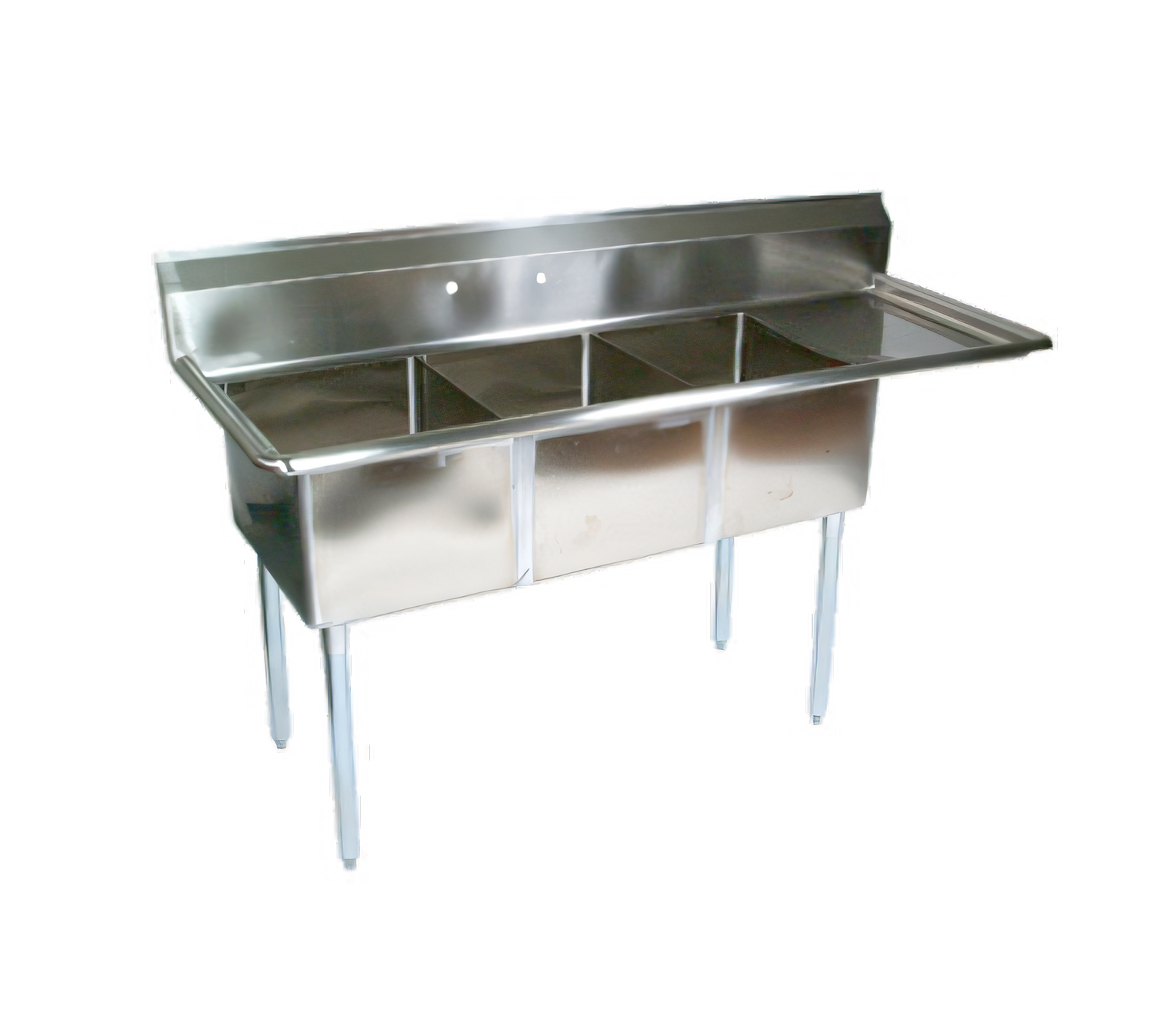 E-Series Sink, 3-compartment, 47-1/2"W x 19-1/2"D x 43-3/4"H overall size, (3) 10"W x 14" front-to-back x 10" deep compartments, 15" drainboard on right, 9-3/4"H boxed backsplash with 45° top and 2" return, (1) set of splash mount faucet holes with 8" centers, 3-1/2" diameter die-stamped drain openings, 18/300 stainless steel, galvanized legs & gussets, adjustable plastic bullet feet, NSF, CSA-Sanitation (Available in Effingham and Nevada)