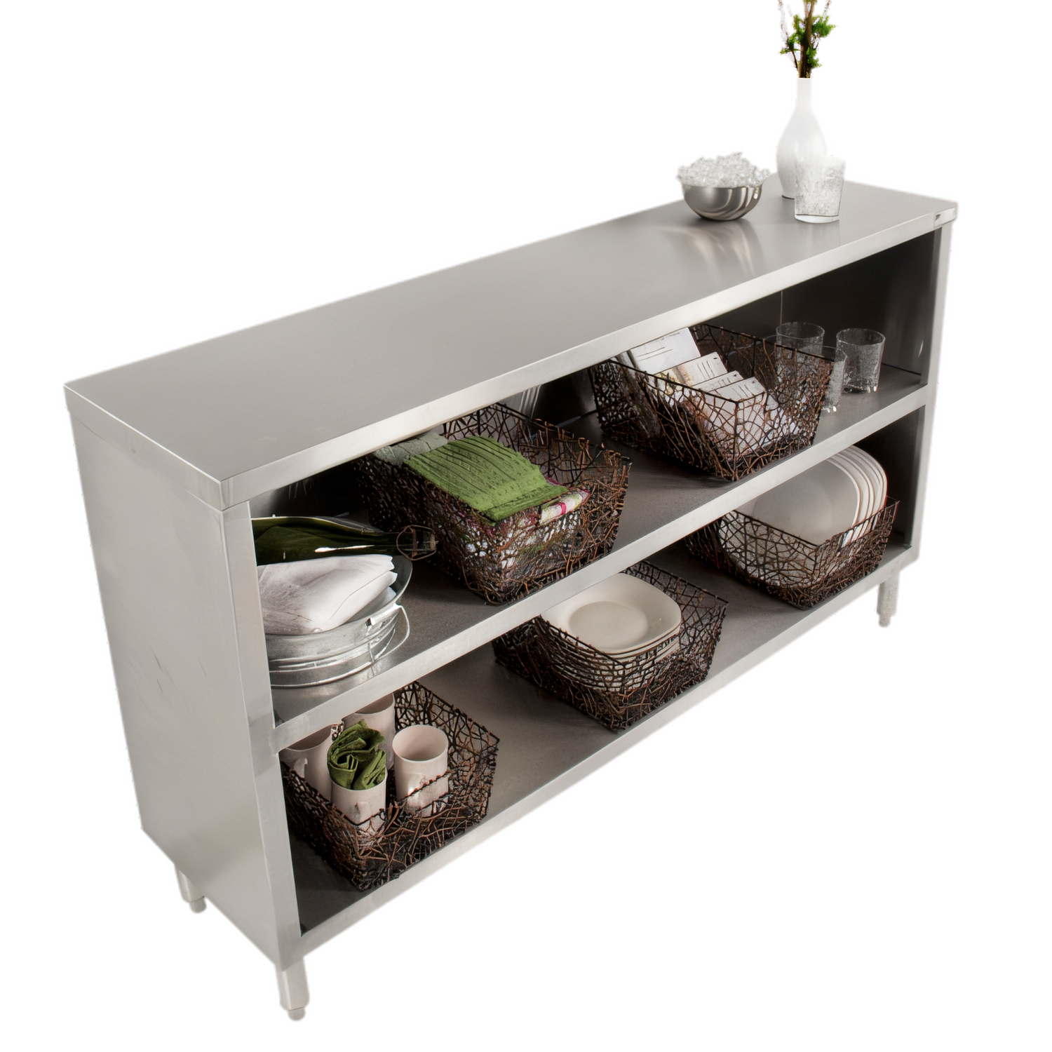 72 in W × 15 in D × 35 in H | Open Front with Mid-ShelfBuilt to thrive in the toughest commercial kitchens, this fully welded stainless steel cabinet keeps plates, trays and cookware organized, protected and always within arm’s reach.