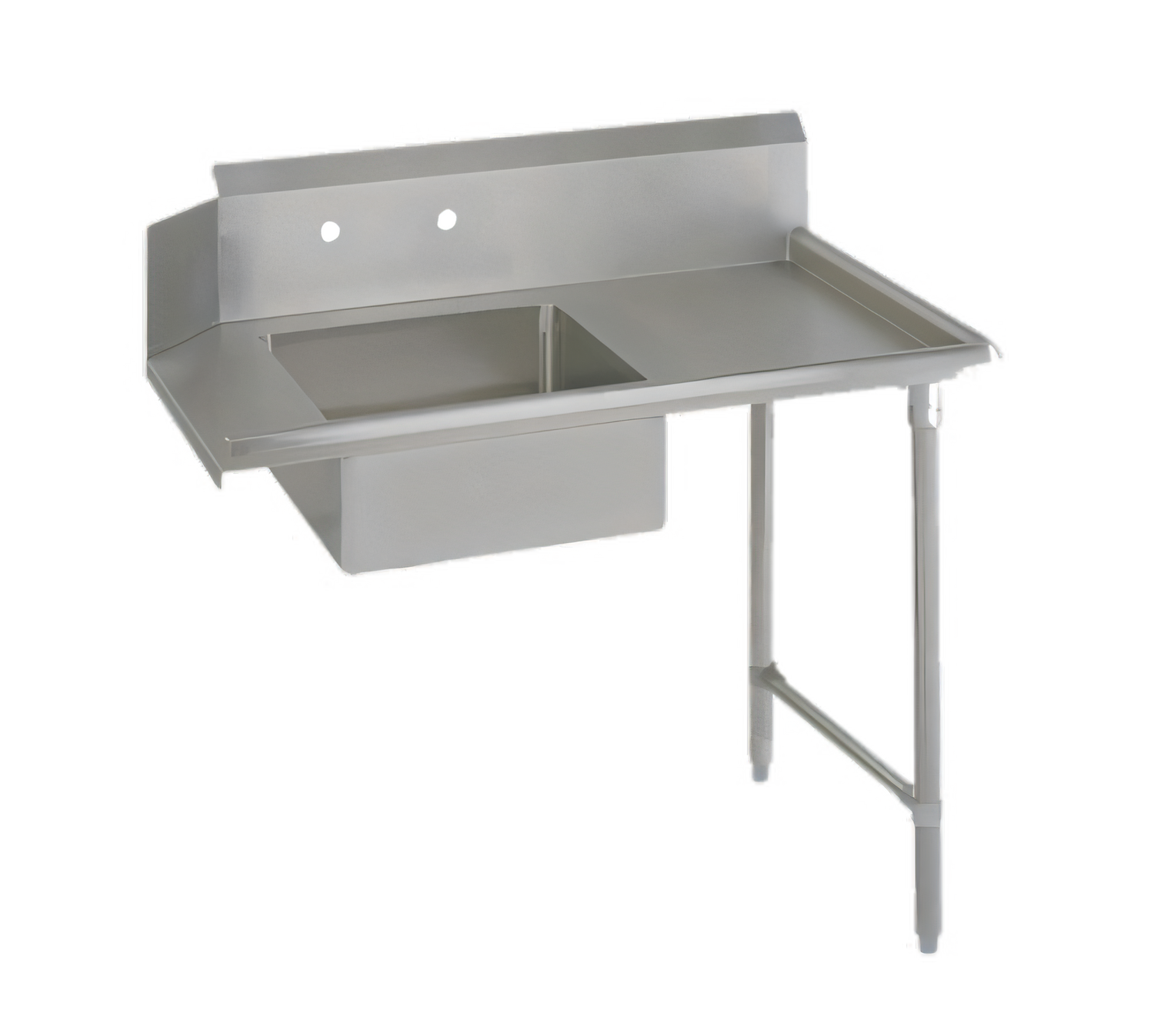 Dishtable, soiled, straight design, 48"W x 30"D x 44"H overall size, for right-to-left operation, (1) 20"W x 20" front-to-back x 8" deep pre-rinse sink, 10" boxed backsplash with 45° top & 2" return, (1) set of splash mount faucet holes with 8" centers, rolled front & side rims, 18/300 stainless steel top, galvanized legs & gussets, adjustable plastic bullet feet, NSF, CSA-Sanitation (Available in Effingham and Nevada)