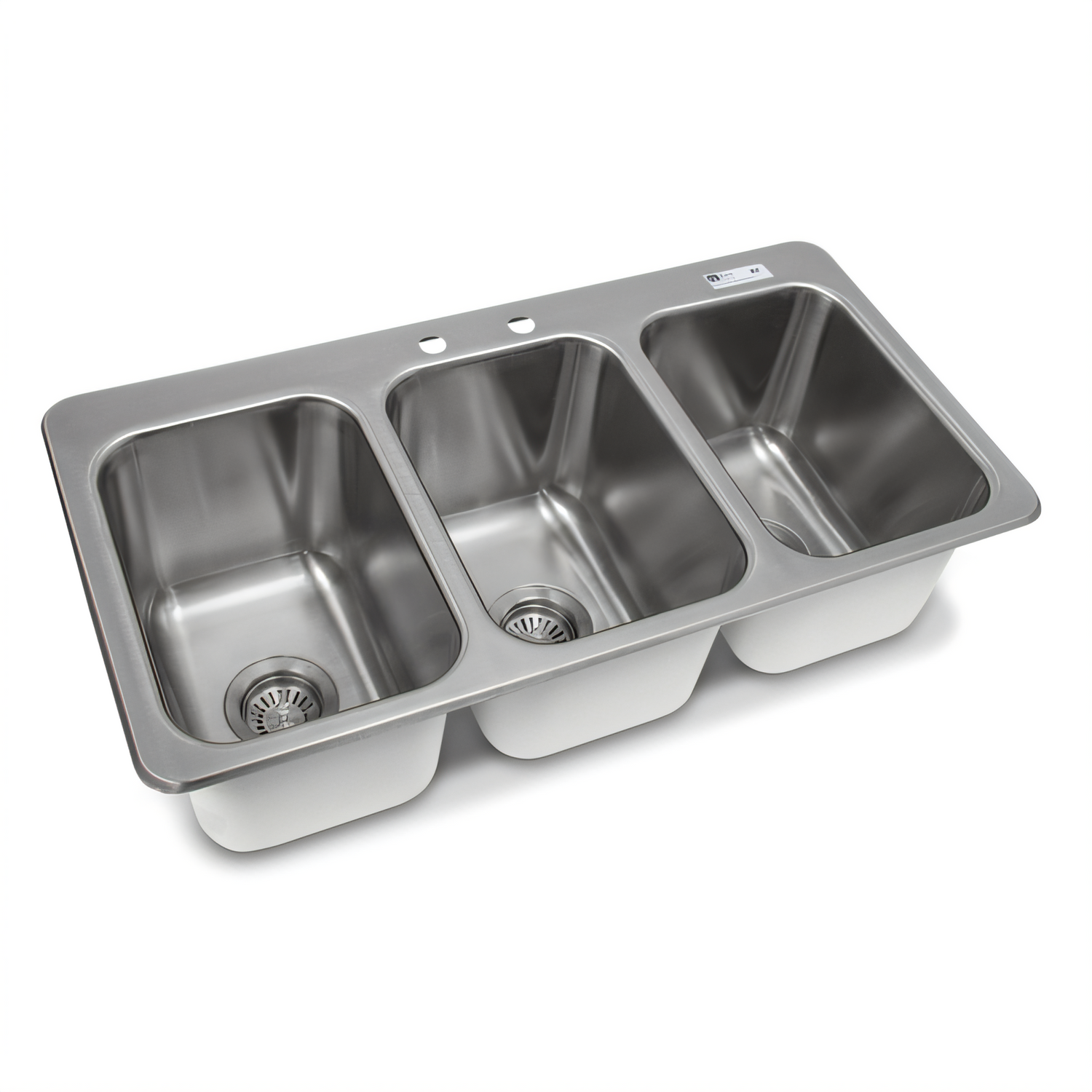 Pro-Bowl Drop-In Sink, 3-compartment, 36"W x 18-1/2"D x 10"H overall size, (3) 10"W x 14" front-to-back x 10"deep bowls, deck mount faucet holes with 4" centers, 3-1/2" drain opening with basket drain, stainless steel construction, (faucet not included), NSF, CSA-Sanitation (Available in Effingham and Nevada)