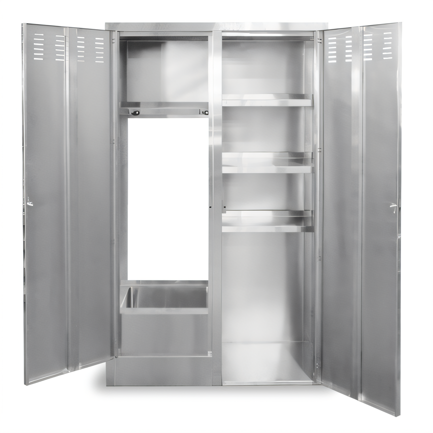 - (2) louvered stainless-steel swing doors with keyed lock handles.