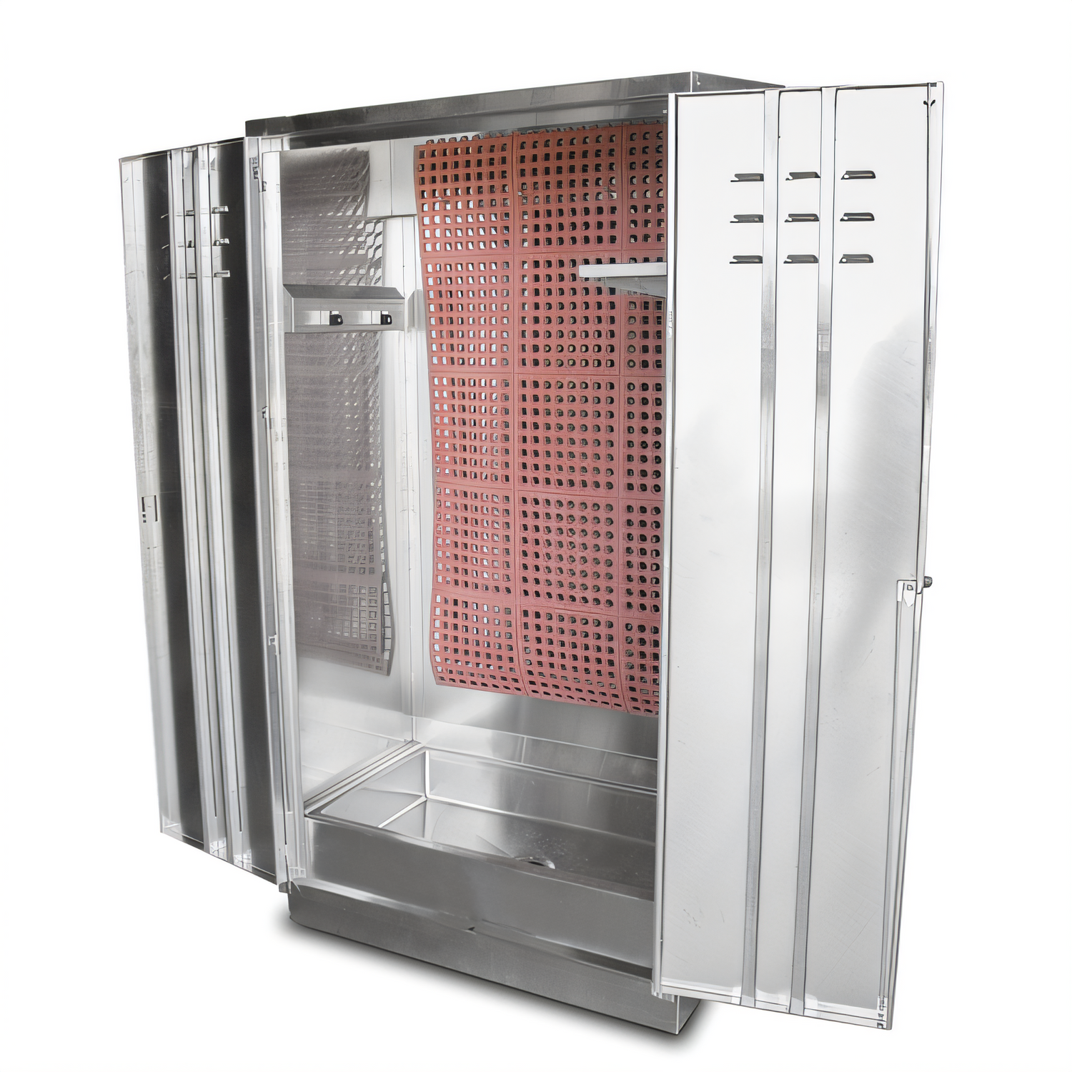 Model PBMC-224884 • 48" W x 22-1/2" D x 84" HBuilt for busy commercial kitchens, locker rooms and maintenance areas, the John Boos Mat Wash Cabinet combines secure chemical storage, a full-size wash station and integrated mat/mop management in one rugged, stainless-steel enclosure.