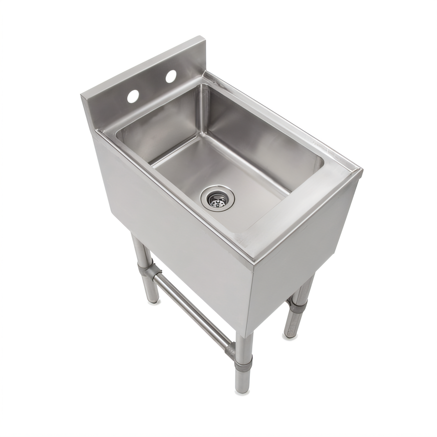Underbar Dump Sink, freestanding, 12"W x 18"D x 32-1/2"H overall size, (1) 10"W x 14" front-to-back x 10" deep fabricated sink bowl, 3"H backsplash, (1) set of removable splash mount faucet holes with 4" centers, includes 9-1/2” x 6” x 5” deep perforated dump basket, 18/300 stainless steel construction, stainless steel legs & side bracing, adjustable stainless steel bullet feet, NSF (weights are subject to additional packaging)