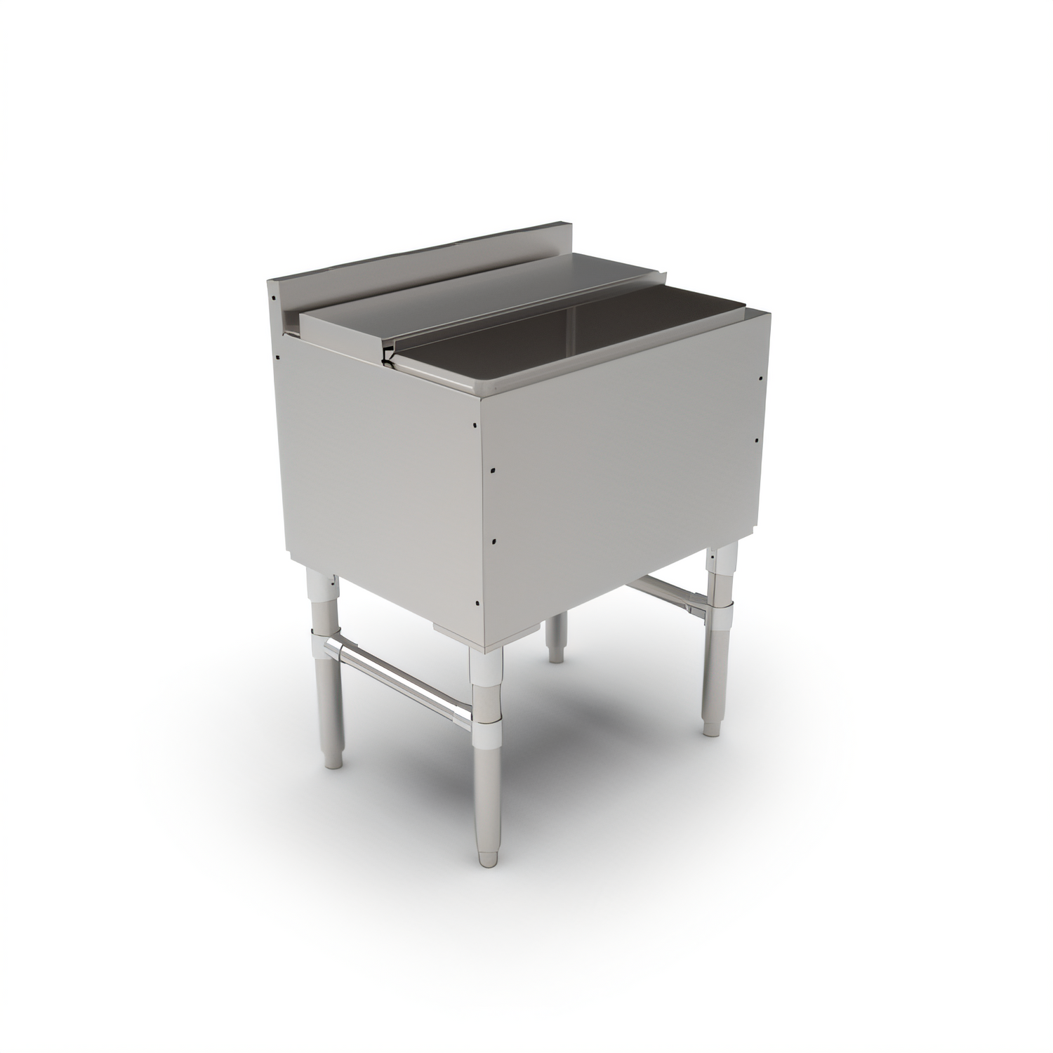 Slim-Line Underbar Ice Bin/Cocktail Unit, 24"W x 18"D x 32-1/2"H overall size, 22"W x 15" front-to-back x 13-1/2" deep insulated ice bin with drain, 3"H backsplash, includes 2-piece sliding lid, 18/300 stainless steel construction, stainless steel legs & side bracing, adjustable stainless steel bullet feet, NSF (weights are subject to additional packaging)