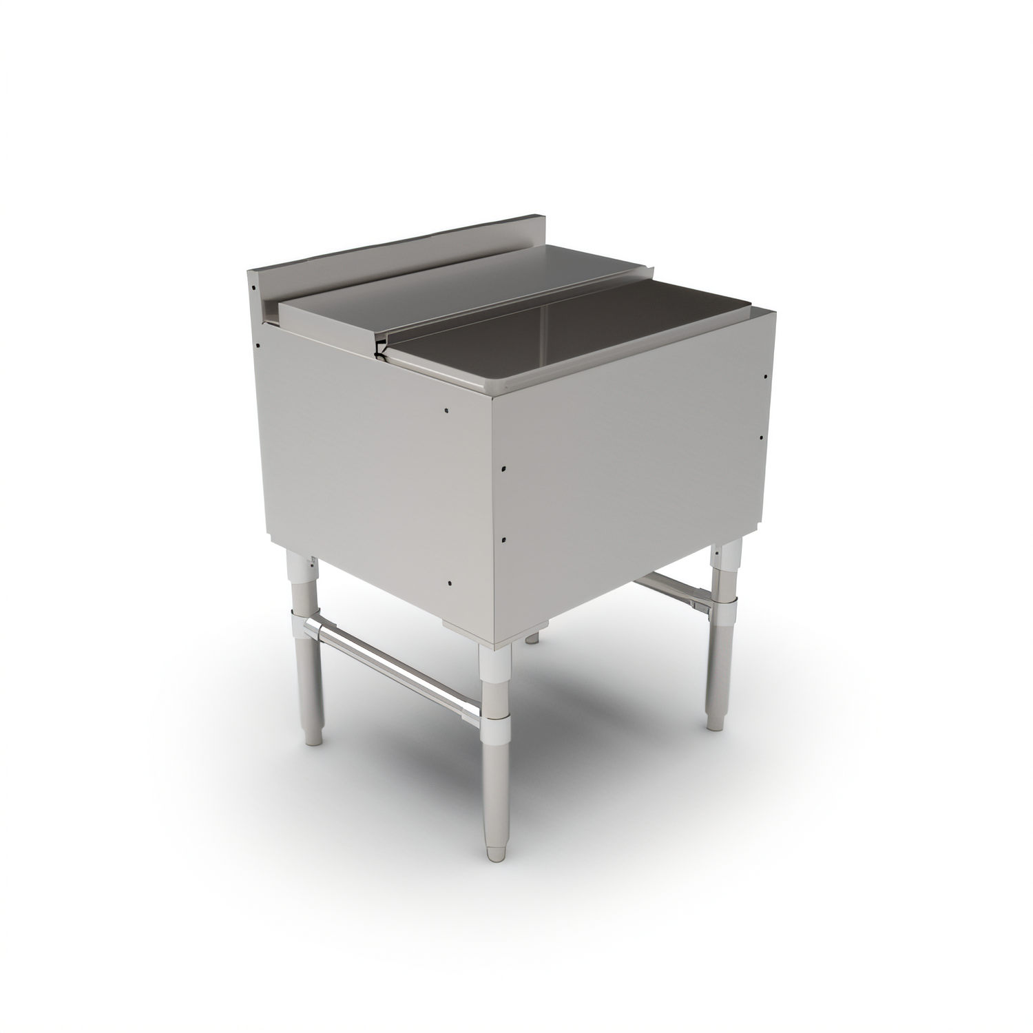 John Boos UBIB-2124-X Underbar Ice Bin/Cocktail Unit — commercial-grade 18/300 stainless steel construction for durability and easy cleaning. Compact 24" W x 21" D x 32.5" H profile with a 22" x 18" x 13.5" insulated ice bin, built-in drain, 3" backsplash, and 2-piece sliding lid for fast service in busy bars. NSF-certified with adjustable stainless steel legs and side bracing—ideal for restaurants, bars, and catering setups.