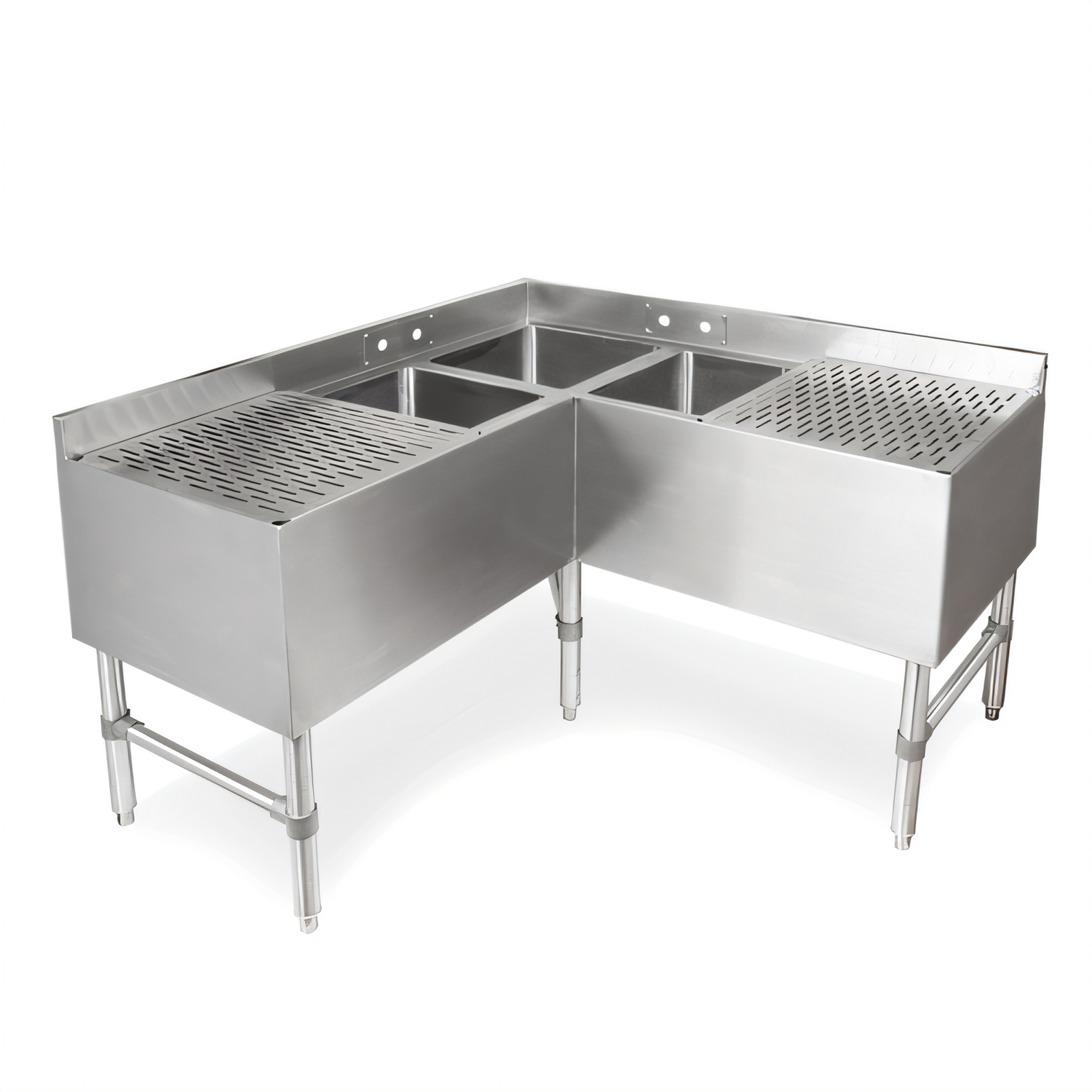 48" W x 18" D x 32-1/2" H • 3 Compartments • Dual 18" DrainboardsFree up premium bar space without sacrificing workflow. The NSF-listed John Boos UBS3C-1848-2D18 tucks neatly into a 90° corner, providing three separate 10"-deep wash bays and two full-length drainboards—all in a slim 18" front-to-back footprint.