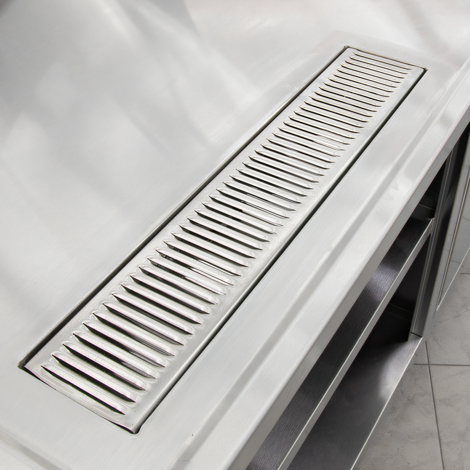 Urn Trough, weld-in, 12"W x 4-3/4"D, 1" MPT drain, removable grate, 16/300 stainless steel construction (installed at factory)
