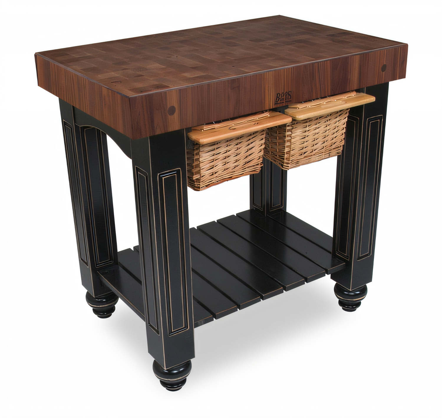 Model WAL-GB3624 | John Boos & Co.Hand-crafted in the USA from rich American Black Walnut, the American Heritage Gathering Block II combines a 4-inch thick end-grain cutting surface with a charming, furniture-grade base and dual wicker storage baskets. It is the perfect marriage of professional-quality butcher block and timeless farmhouse style—ready to anchor your kitchen, prep heavy ingredients, and serve as a stunning entertaining station.