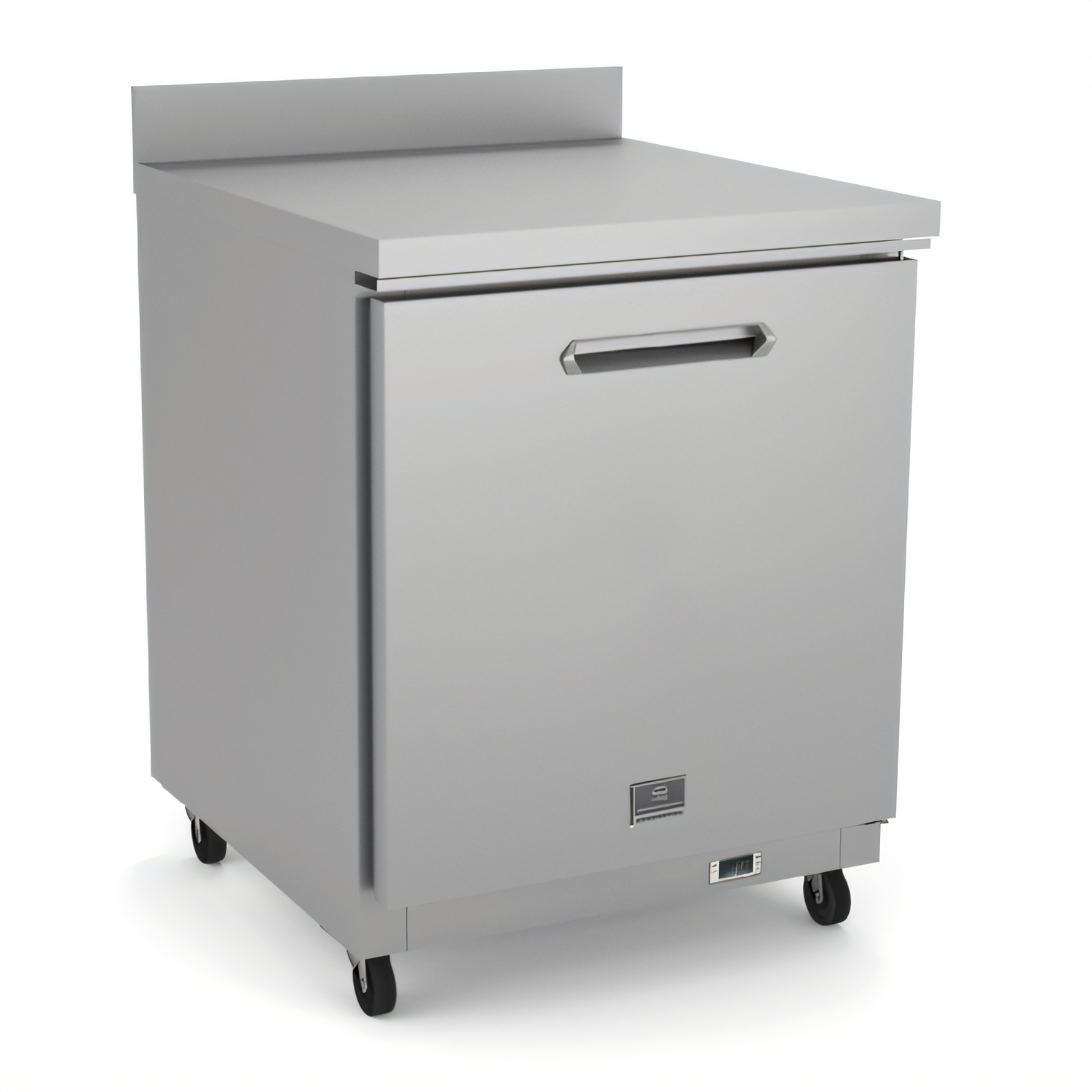 (738303) Counter Top Freezer, one-section, 27" wide, 35.5" tall worktop with built in backsplash, self-contained rear bottom mounted refrigeration, 6.5 cu. ft. capacity, (1) solid right hinged door with removable magnetic gasket, external digital temperature controller, -10/+9°F temperature range, auto defrost, (1) adjustable vinyl coated steel shelf, on site reversible door, 304 stainless steel worktop, stainless steel interior bottom and back panels, white polystyrene interior side panels, galvanized & stainless steel exterior, heavy duty casters, self-closing door with 90-degree stay-open feature, fin & tube condenser to improve performance in high temperature environments, R290 Hydrocarbon refrigerant, 115v/60/1-ph, 1/4 hp, 1.9 amps, NEMA 5-15P, cETLus, ETL-Sanitation. 3/5 Years warranty.
