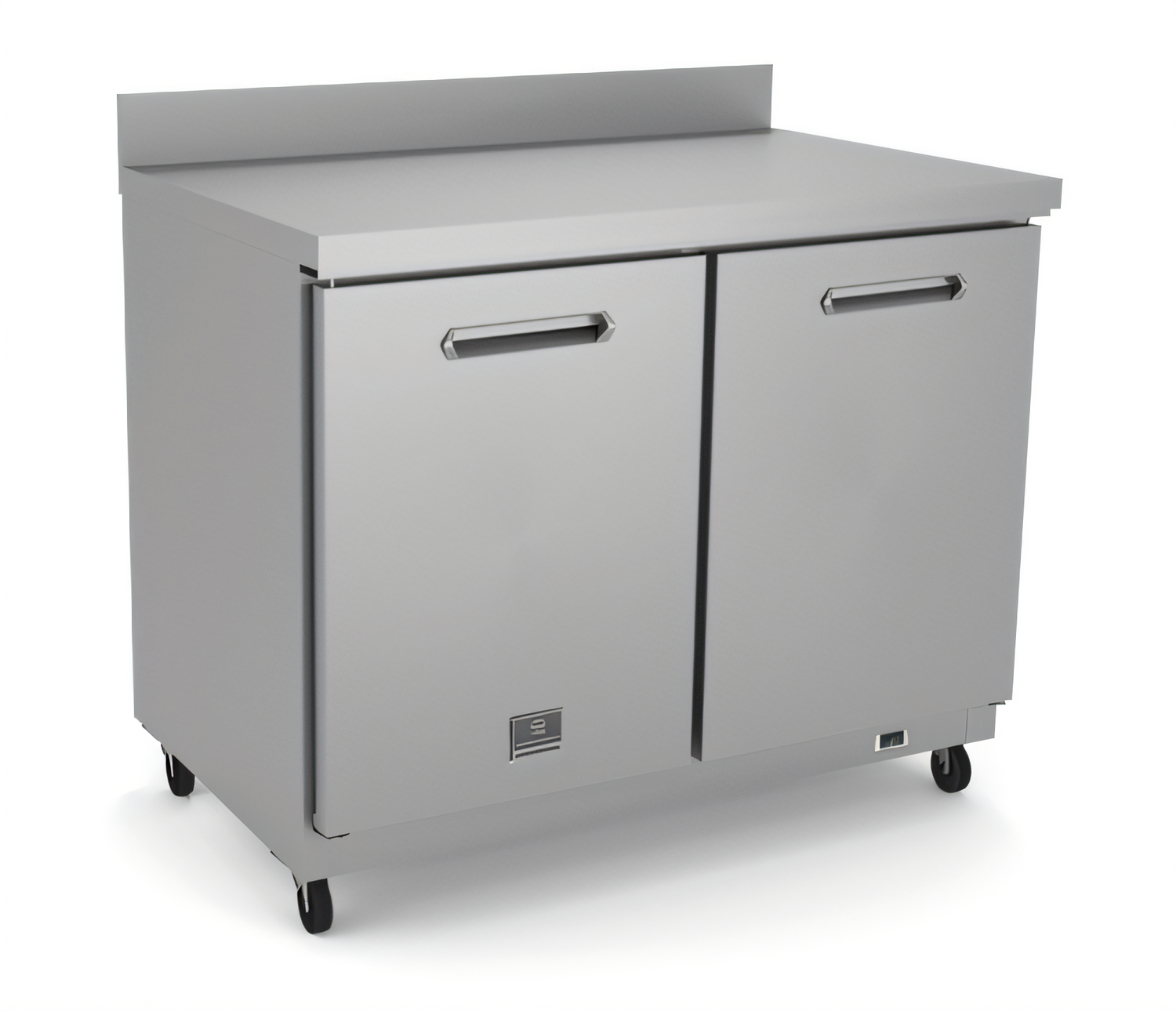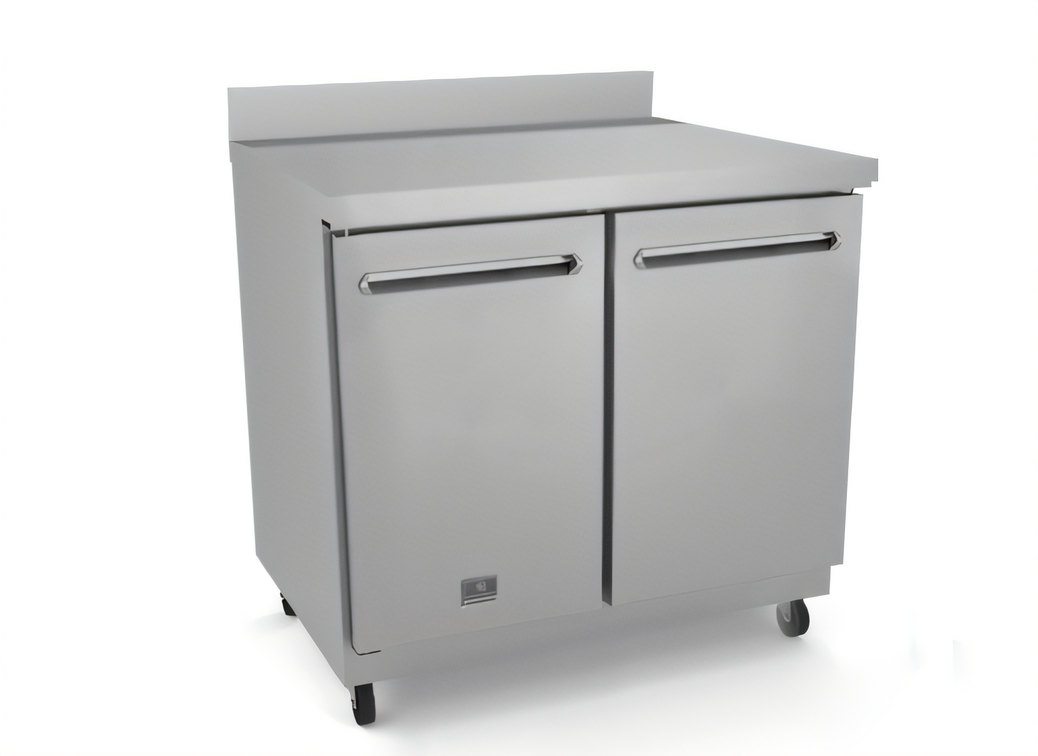 (738339) Counter Top Freezer, two-section, 36" wide, 35.5" tall worktop with built in backsplash, self-contained rear bottom mounted refrigeration, 8.9 cu. ft. capacity, (2) solid hinged doors with removable magnetic gaskets, external digital temperature controller, -10/+9°F temperature range, auto defrost, (2) adjustable vinyl coated steel shelves, 304 stainless steel worktop, stainless steel interior bottom and back panels, white polystyrene interior side panels, galvanized & stainless steel exterior, heavy duty casters, self-closing door with 90-degree stay-open feature, fin & tube condenser to improve performance in high temperature environments, R290 Hydrocarbon refrigerant, 115v/60/1-ph, 1/4 hp, 3.0 amps, NEMA 5-15P, cETLus, ETL-Sanitation. 3/5 Years warranty.