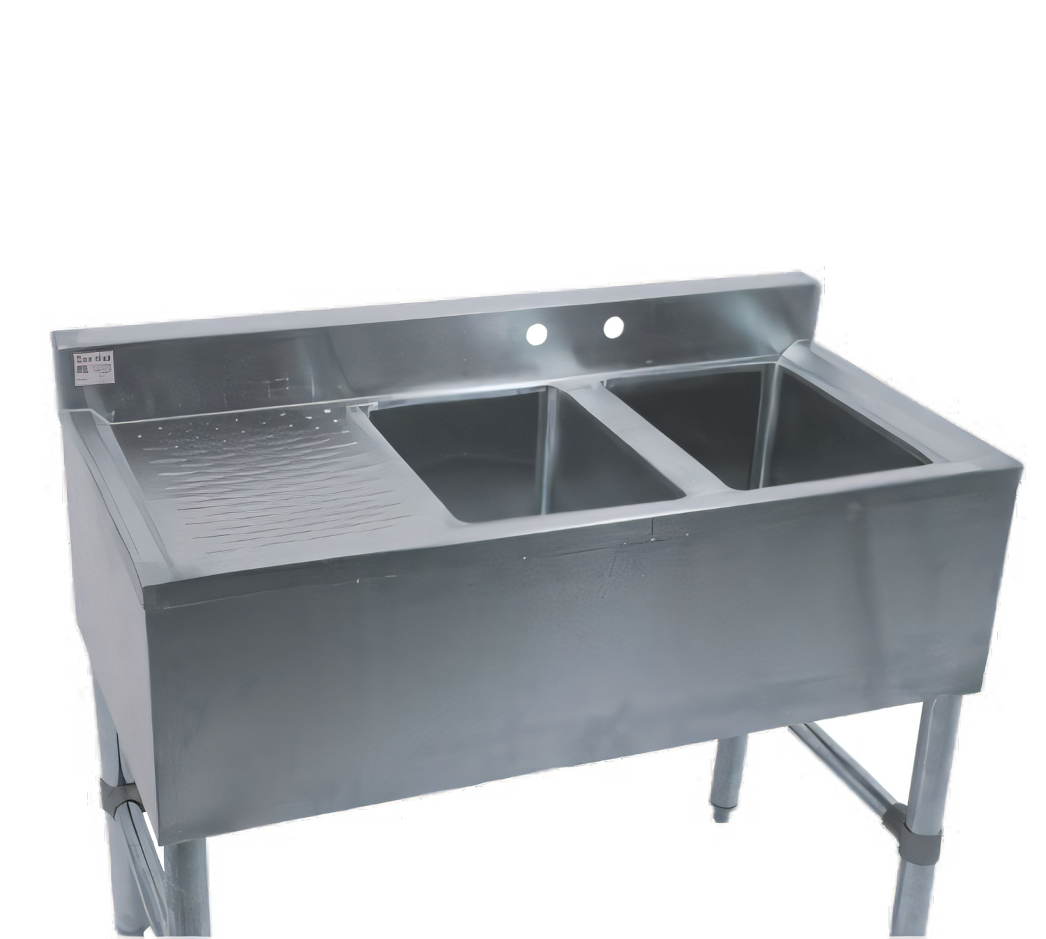 Underbar Sink, two compartment, 37"W x 18-3/4"D x 33"H, 18/304 stainless steel construction, 10"W x 14" front-to-back x 10" deep compartments, 12-3/4" drainboard on left, 3"H backsplash, 4" OC splash mount faucet holes, stainless steel apron on front & sides, gussets, stainless steel legs & side crossbracing with stainless steel bullet feet, includes: (2) drain baskets & (1) 10" faucet, ETL-Sanitation