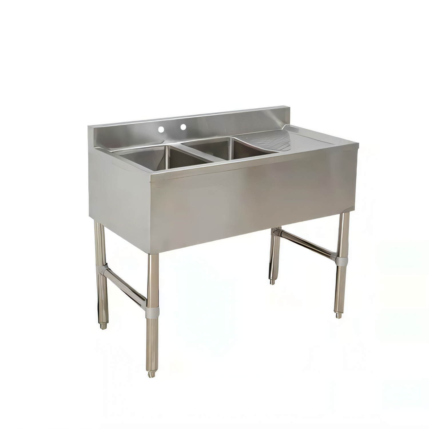 Underbar Sink, two compartment, 37"W x 18-3/4"D x 33"H, 18/304 stainless steel construction, 10"W x 14" front-to-back x 10" deep compartments, 12-3/4" drainboard on right, 3"H backsplash, 4" OC splash mount faucet holes, stainless steel apron on front & sides, gussets, stainless steel legs & side crossbracing with stainless steel bullet feet, includes: (2) drain baskets & (1) 10" faucet, ETL-Sanitation