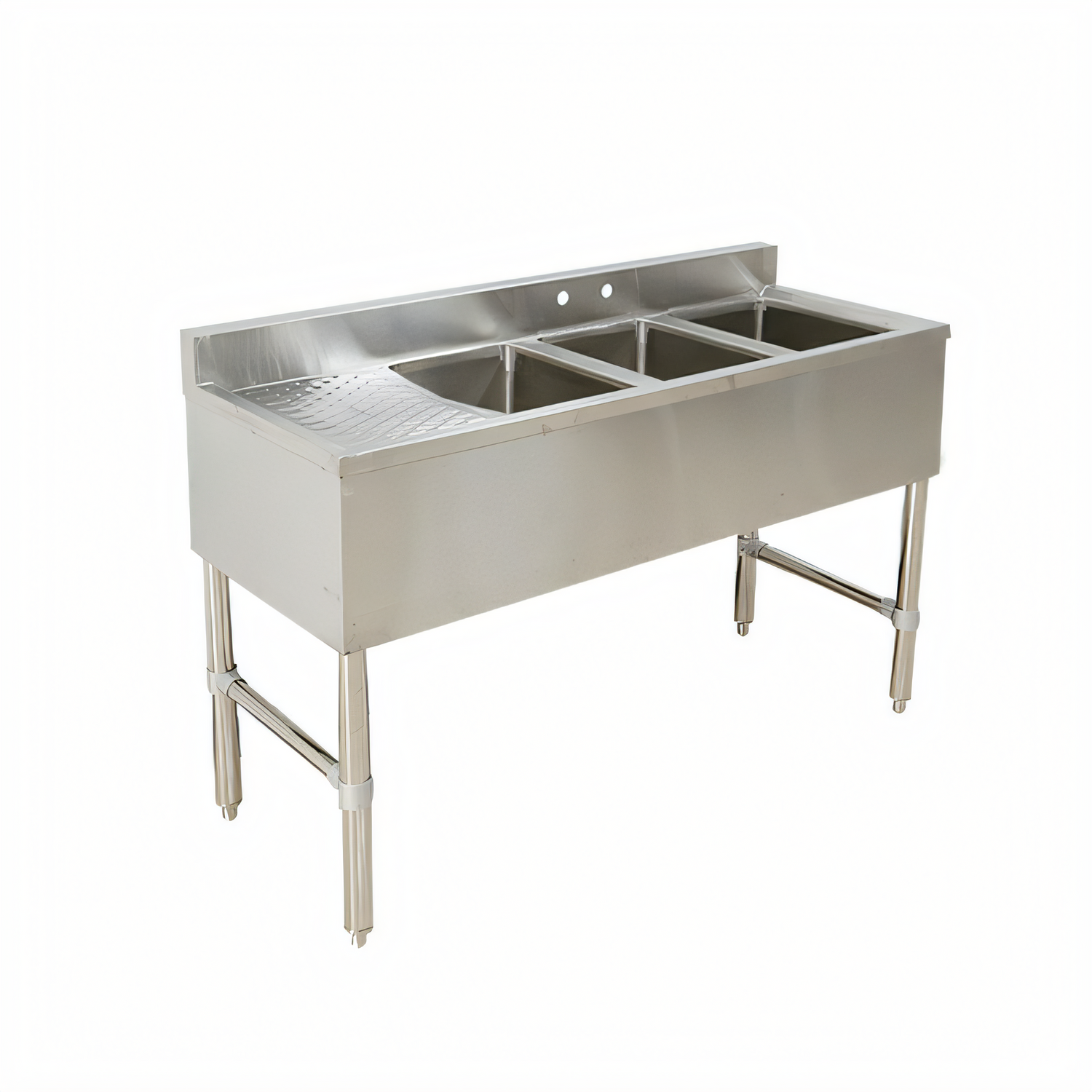 Underbar Sink, three compartment, 49"W x 18-3/4"D x 33"H, 18/304 stainless steel construction, 10"W x 14" front-to-back x 10" deep compartments, 12-3/4" drainboard on left, 3"H backsplash, 4" OC splash mount faucet holes, stainless steel apron on front & sides, gussets, stainless steel legs & side crossbracing with stainless steel bullet feet, includes: (2) drain baskets & (1) 10" faucet, ETL-Sanitation