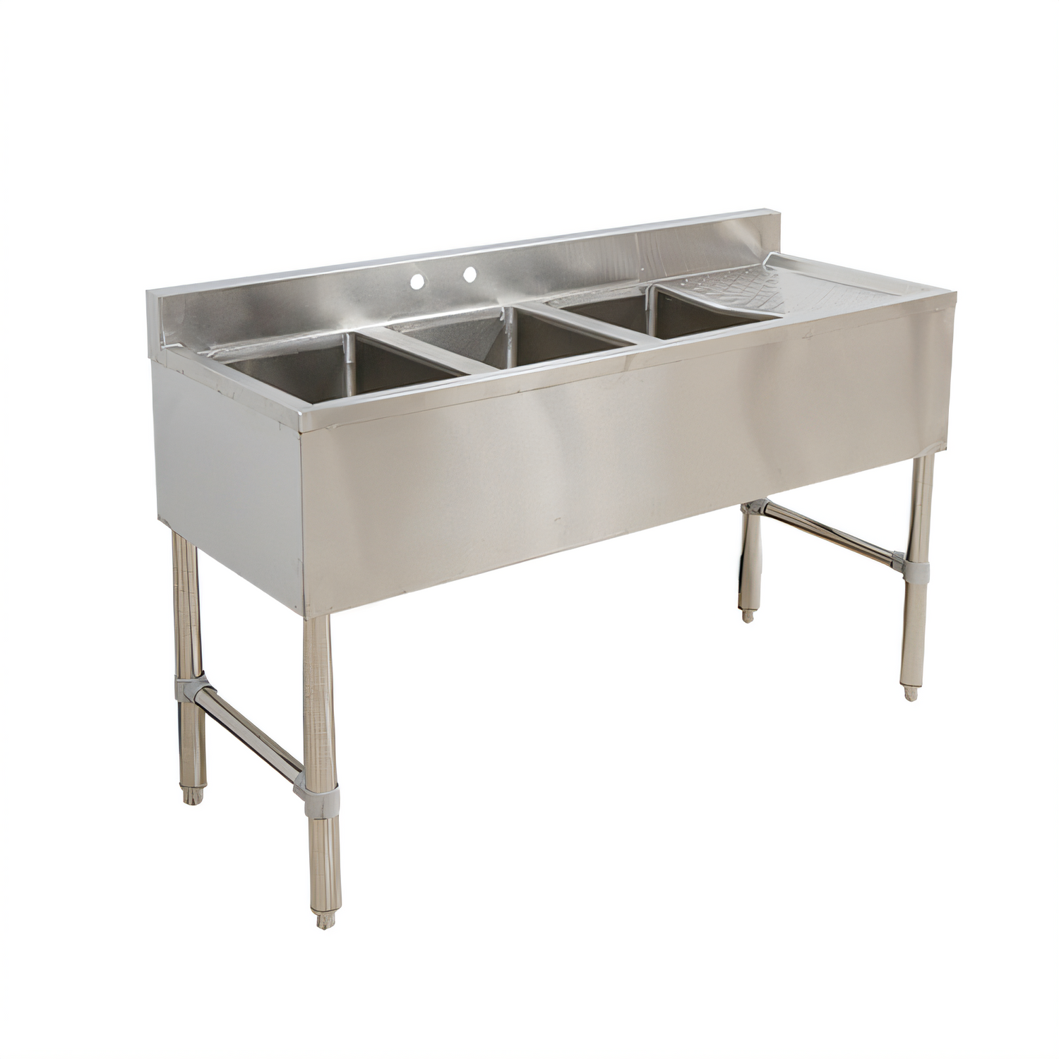 Underbar Sink, three compartment, 49"W x 18-3/4"D x 33"H, 18/304 stainless steel construction, 10"W x 14" front-to-back x 10" deep compartments, 12-3/4" drainboard on right, 3"H backsplash, 4" OC splash mount faucet holes, stainless steel apron on front & sides, gussets, stainless steel legs & side crossbracing with stainless steel bullet feet, includes: (2) drain baskets & (1) 10" faucet, ETL-Sanitation