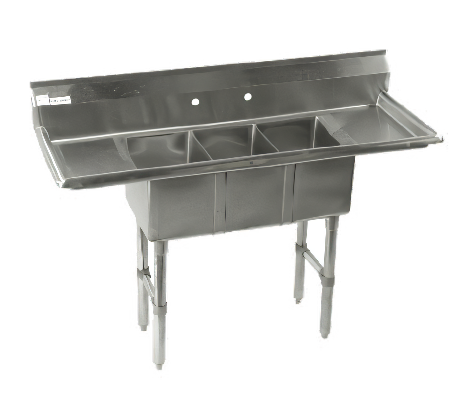 Convenience/Deli Sink, three compartment, 54"W x 19-1/2"D x 41"H, 18/304 stainless steel construction, (3) 10"W x 14" front-to-back x 10" deep compartments, 8-1/2"H backsplash, (2) 12" drainboards, 8" OC splash mount faucet holes, stainless steel bowl, body, legs & feet, includes 3-1/2" drain basket, ETL