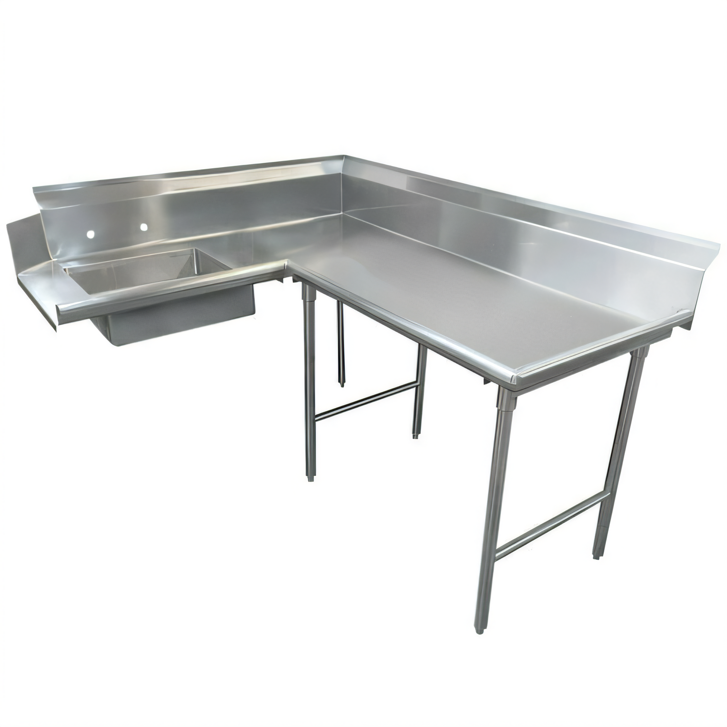 Model DTS3084 (Left- or Right-Hand) • NSF CertifiedBuilt for the toughest dishrooms, this heavy-duty corner soiled dish table streamlines your scrape-and-rinse area while standing up to years of high-volume use. A roomy 20" x 20" x 5" pre-rinse sink, generous landing surfaces, and all-stainless construction make it the perfect partner for any commercial dishmachine.