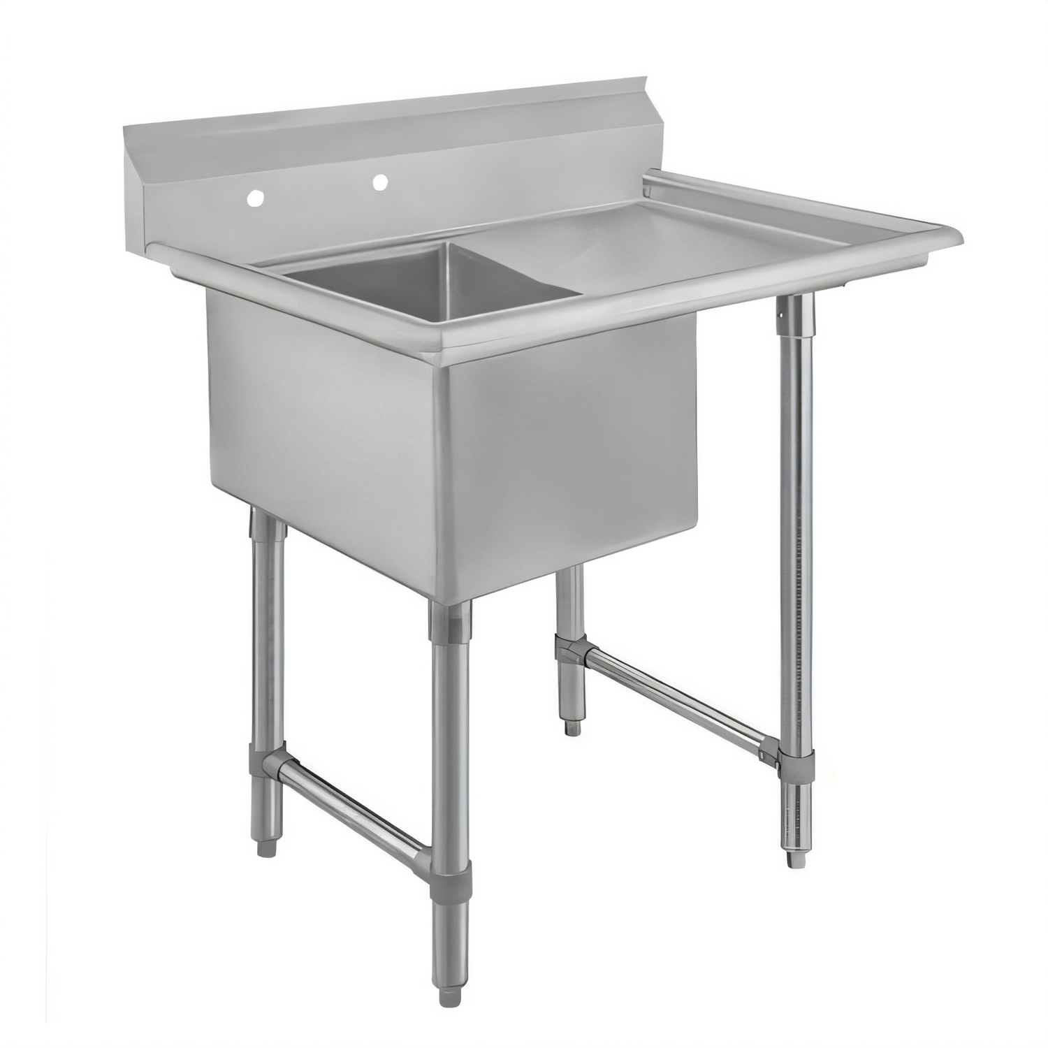 Klinger's Trading ECS11824DR24 Economy 1-Compartment Sink — 44-1/2" W x 29-1/2" D x 41" H with 24" right drainboard. Heavy-duty 18/304 stainless steel, 18" x 24" x 14" deep basin, 9" backsplash and 8" O.C. splash-mount faucet holes. Includes stainless steel gussets, legs, crossbracing, adjustable bullet feet and NSF certification — durable, commercial-grade prep and cleanup solution.