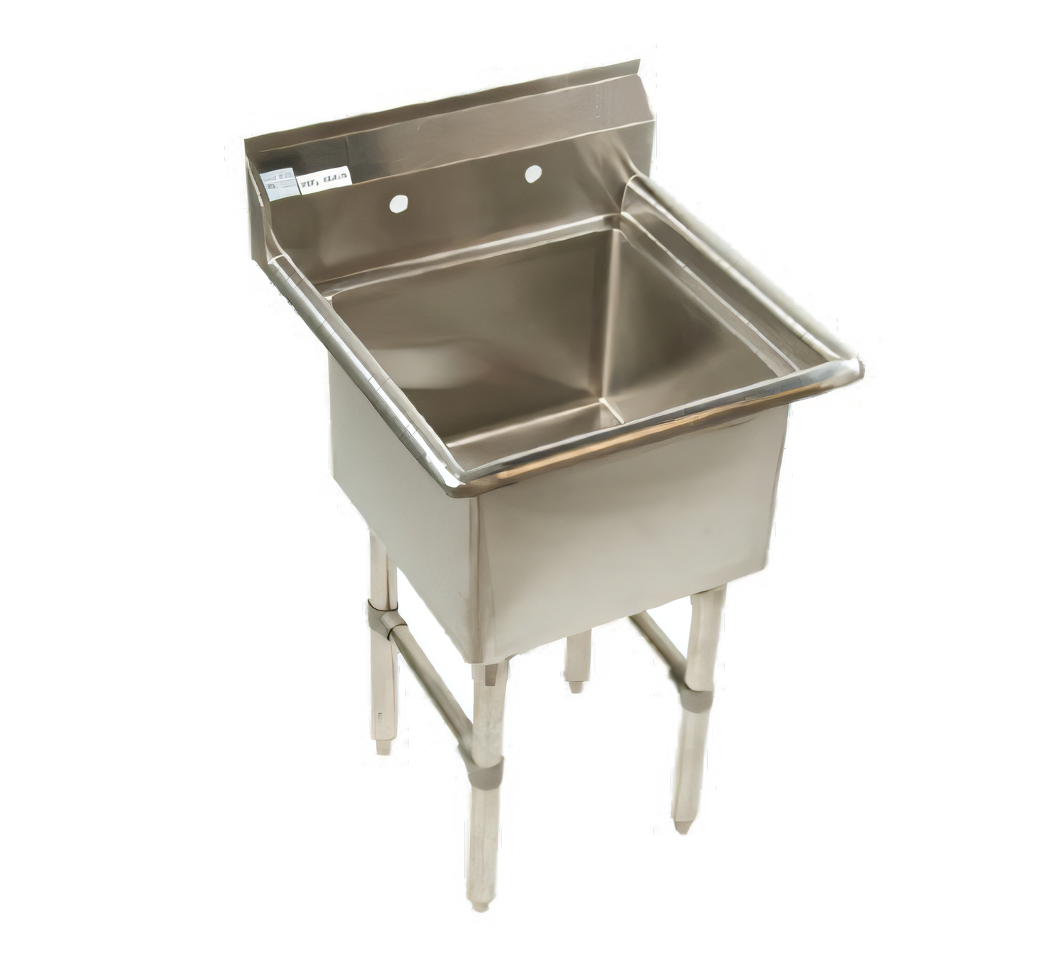 Economy Sink, one compartment, 29"W x 29-1/2"D x 41"H, 18/304 stainless steel construction, 24" x 24" x 12" deep compartment, 9"H backsplash, 8" O.C splash mount faucet holes, stainless steel gussets, legs, crossbracing, & adjustable bullet feet, ETL