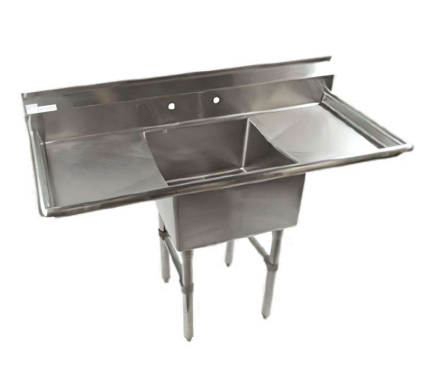 Economy Sink, one compartment, 52"W x 26"D, 18/304 stainless steel construction, 16"W x 20" front-to-back x 11" deep compartment, 9"H backsplash, (2) 18" drainboards, 8" O.C splash mount faucet holes, stainless steel gussets, legs, crossbracing, & adjustable bullet feet, NSF