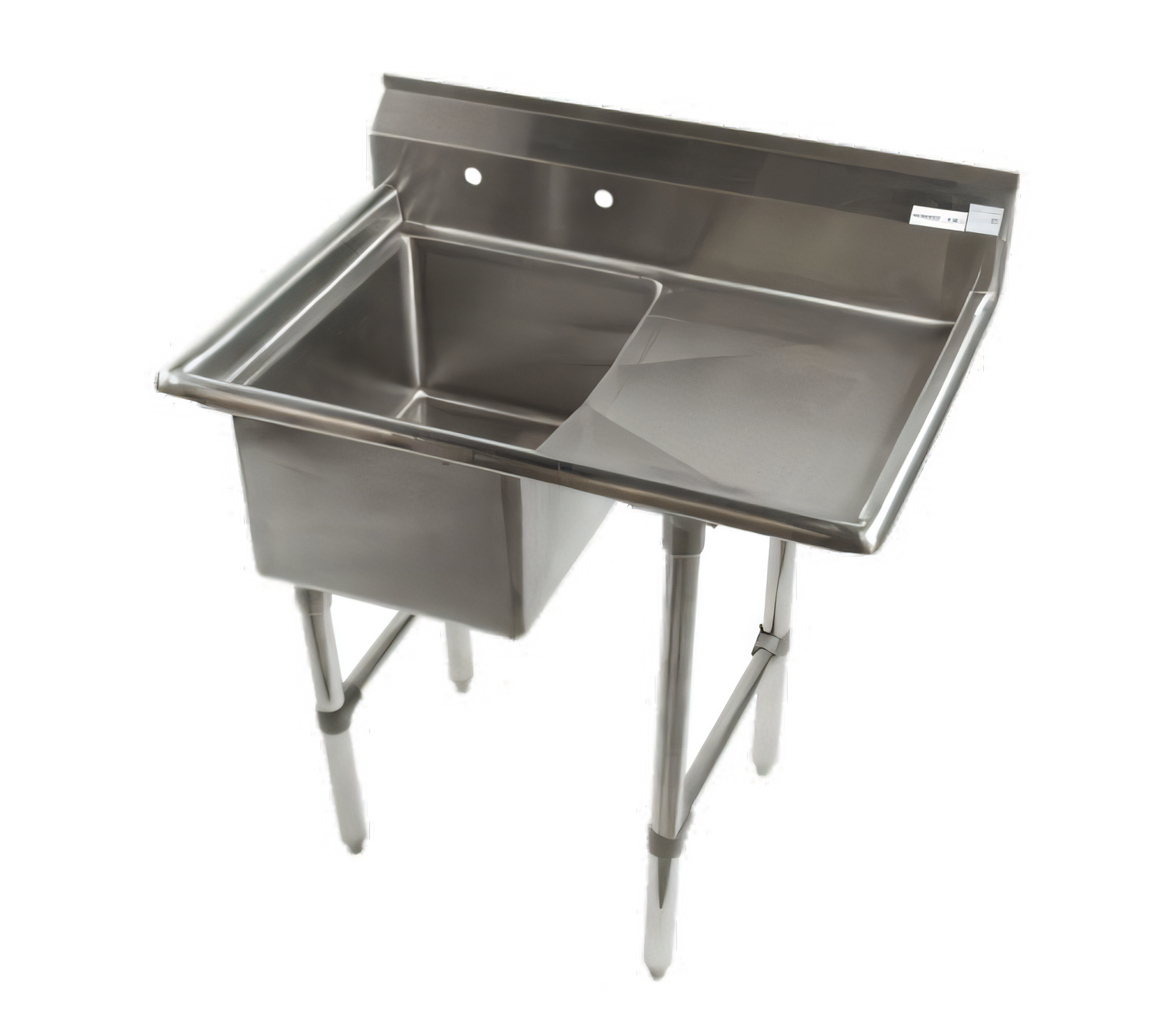 Economy Sink, one compartment, 36-1/2"W x 25-1/2"D X 41"H, 18/304 stainless steel construction, 16"W x 20" front-to-back x 11" deep compartment, 9"H backsplash, 18" right drainboard, 8" O.C splash mount faucet holes, stainless steel gussets, legs, crossbracing, & adjustable bullet feet, ETL