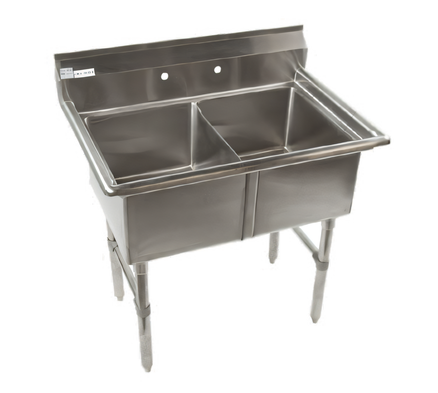 Economy Sink, two compartment, 37"W x 26"D x 41"H, 18/304 stainless steel construction, (2) 16" wide x 20" front-to-back x 11" deep bowls, 9"H backsplash, 8" O.C splash mount faucet holes, stainless steel gussets, legs, crossbracing, & adjustable bullet feet, ETL