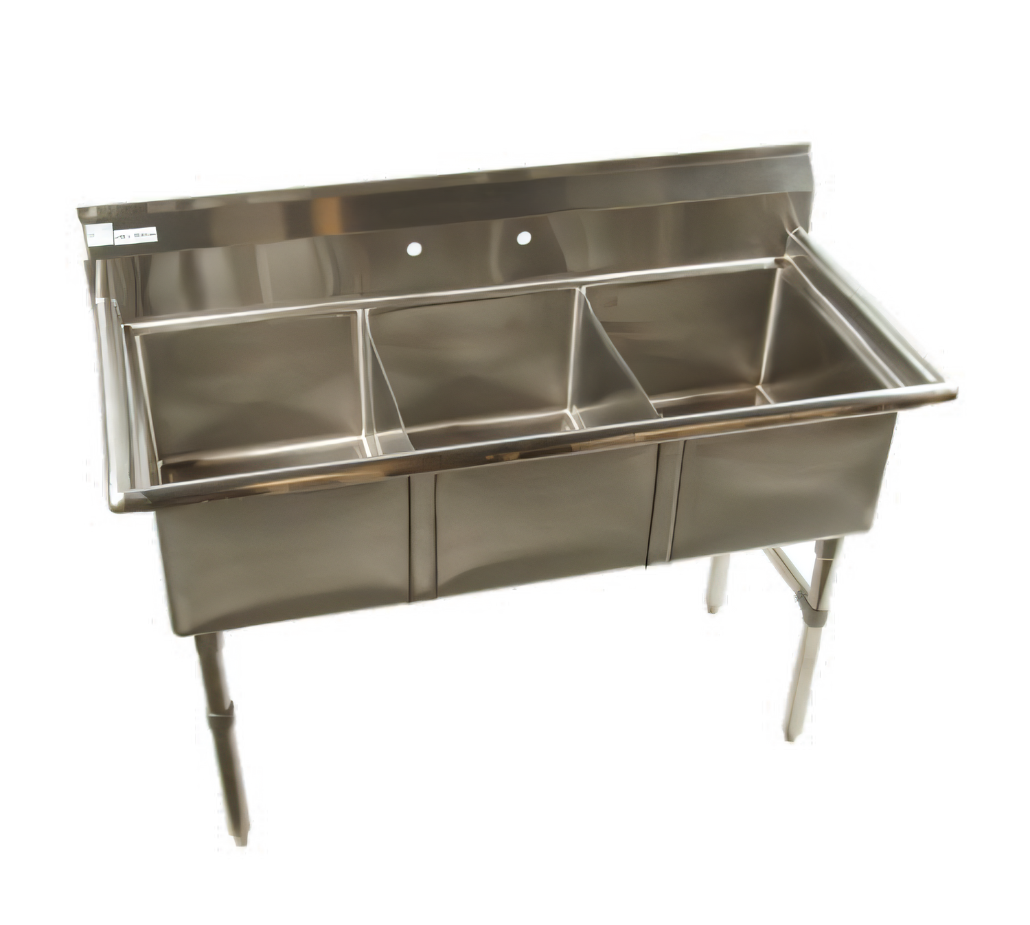 Economy Sink, three compartment, 53"W x 25-1/2"D x 41"H, 18/304 stainless steel construction, (3) 16" wide x 20" front-to-back x 11" deep compartments, 9"H backsplash, 8" O.C splash mount faucet holes, stainless steel gussets, legs, crossbracing & adjustable bullet feet, ETL