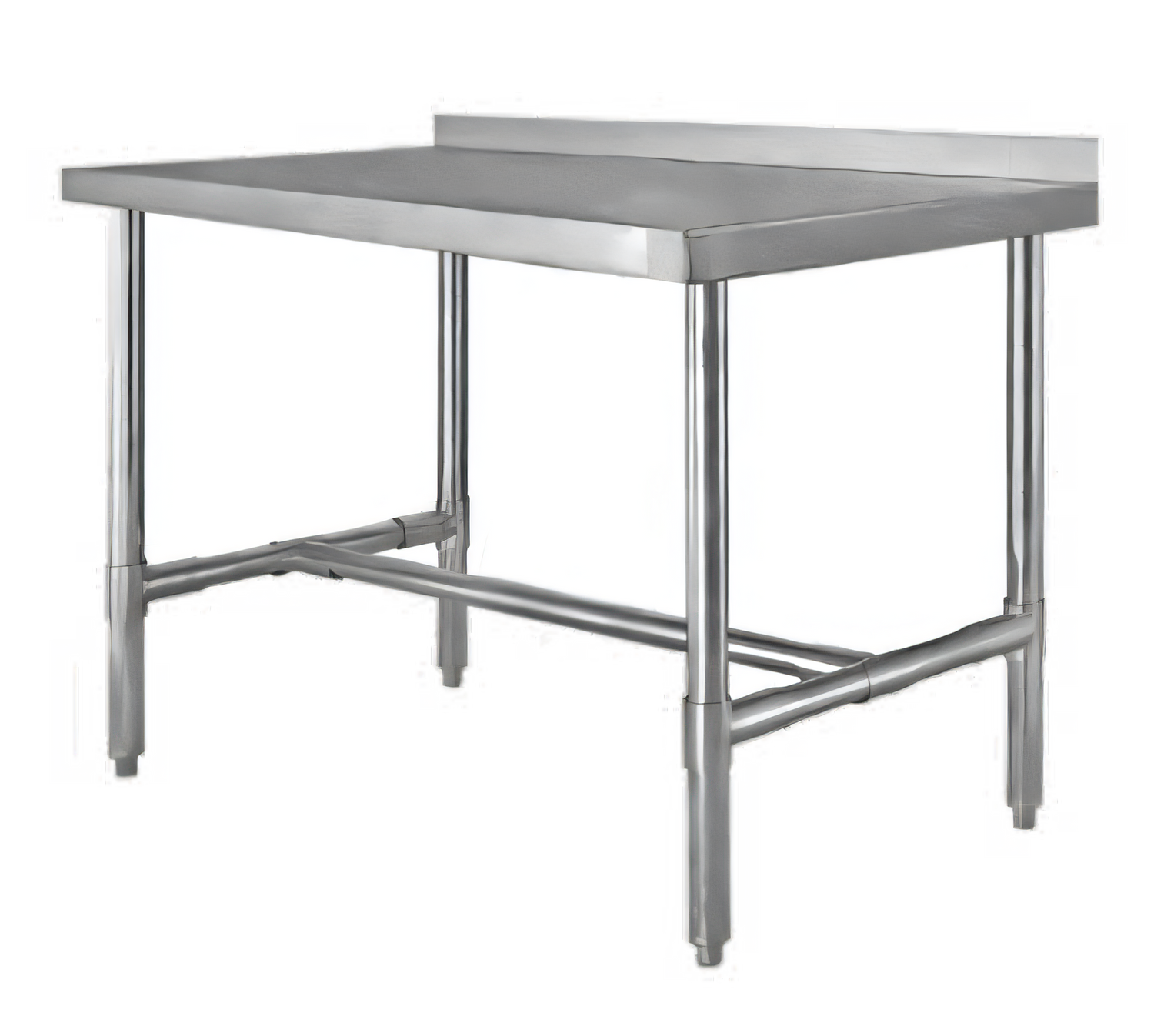 Work Table, open base, 30"W x 30"D x 38"H, 18/430 stainless steel top, 2"H rear up-turn, turned down edges, reinfored with (3) hat channels, stainless steel legs & adjustable cross-bracing (H-Base), NSF