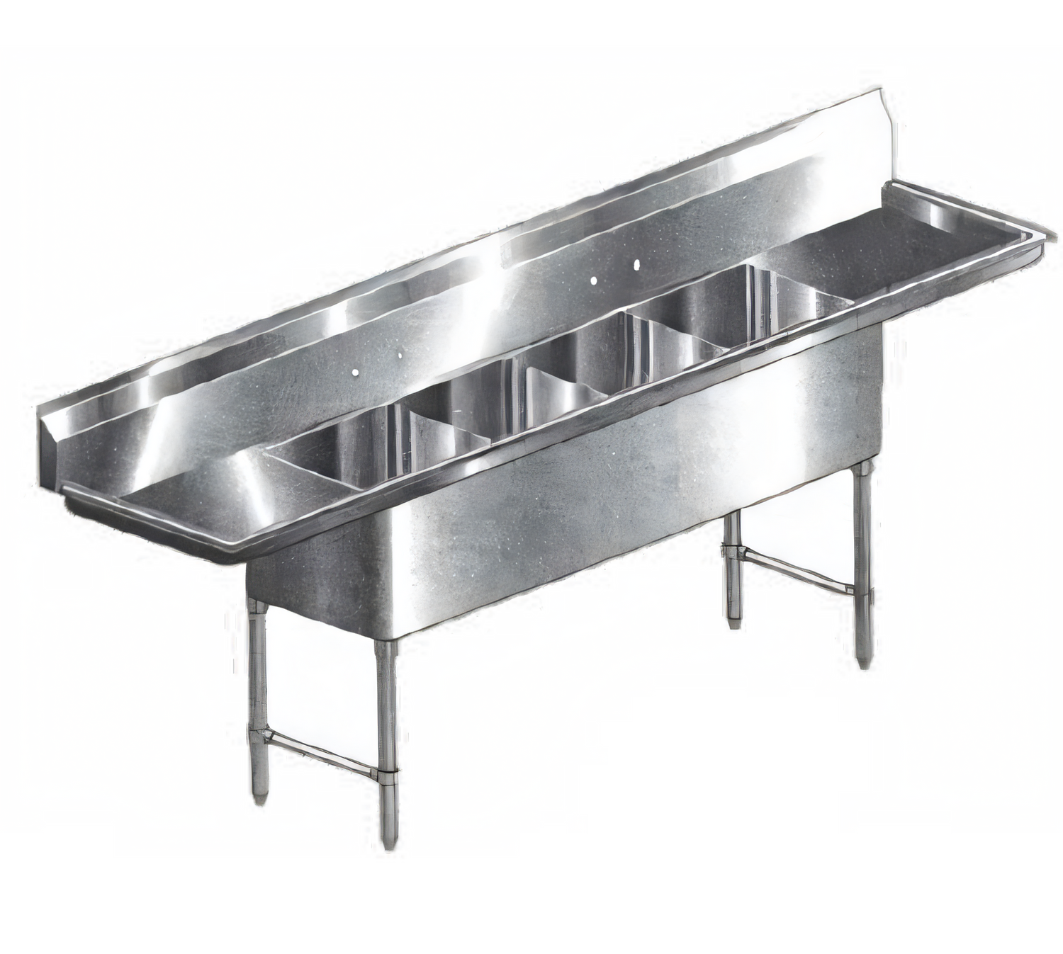 100" W × 25-1/2" D × 41" H • 16-Gauge 304 Stainless Steel • ETL SanitationEngineered for relentless commercial use, this four-bay sink delivers the cleaning capacity you need and the durability you demand. Dual 18" drainboards, a high backsplash, and rugged 16-gauge 304 stainless construction make it the go-to choice for restaurants, bars, hotels, commissaries, and more.