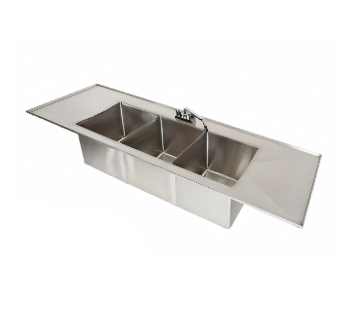 Drop-In Sink, three compartment, (2) 15" drainboards, (3) 15"W x 15" front-to-back x 11" deep bowls, marine edge, 12" deck mount faucet included, 4" OC faucet holes, (3) 3-1/2" basket drains, 16/304 stainless steel construction, 74"W x 21"D cutout required