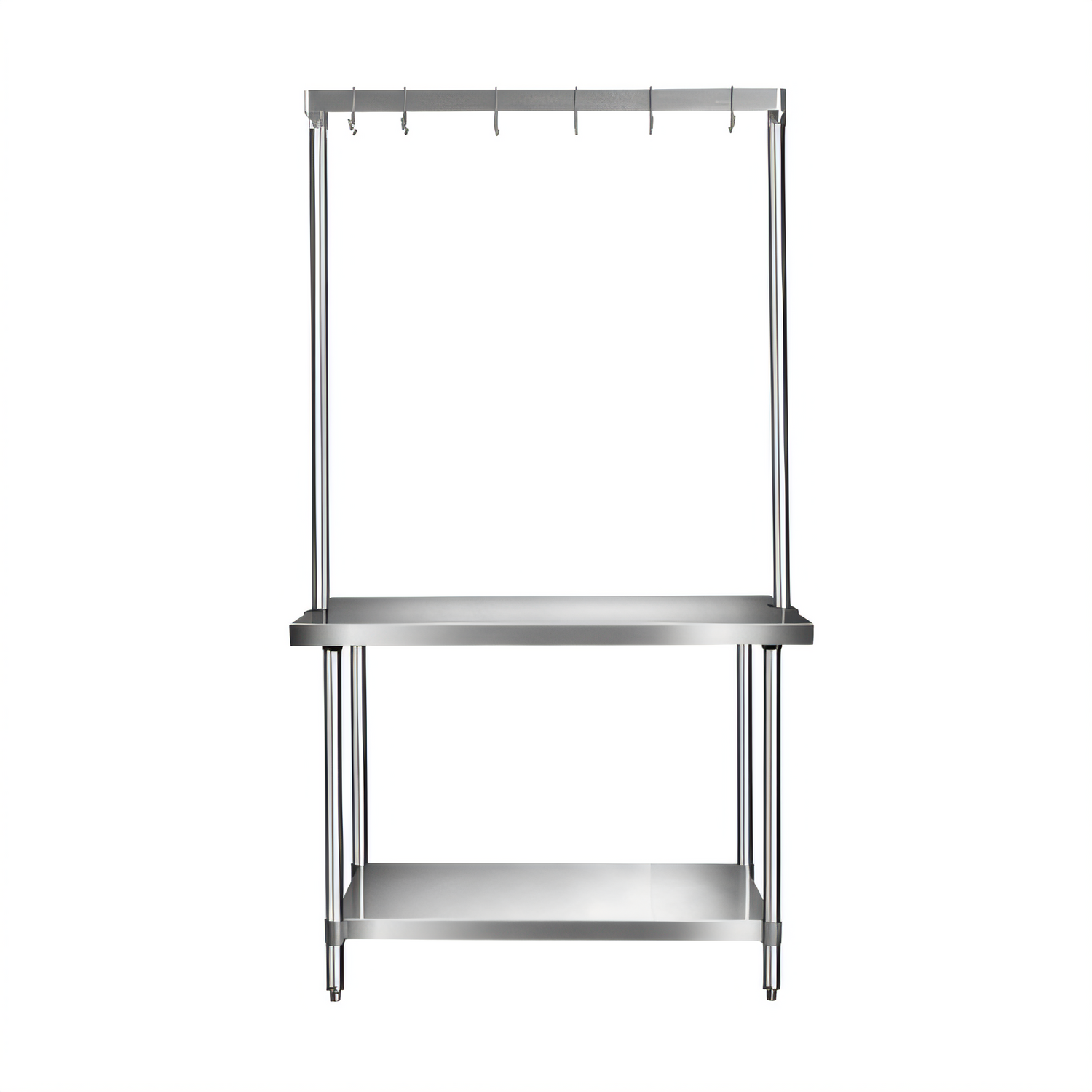 Pot Rack, 36", table mount, adjustable, u-shaped, extends 8" from uprights, 304 stainless steel bar, stainless steel gusset/tubing & double-prong pot hooks, NSF