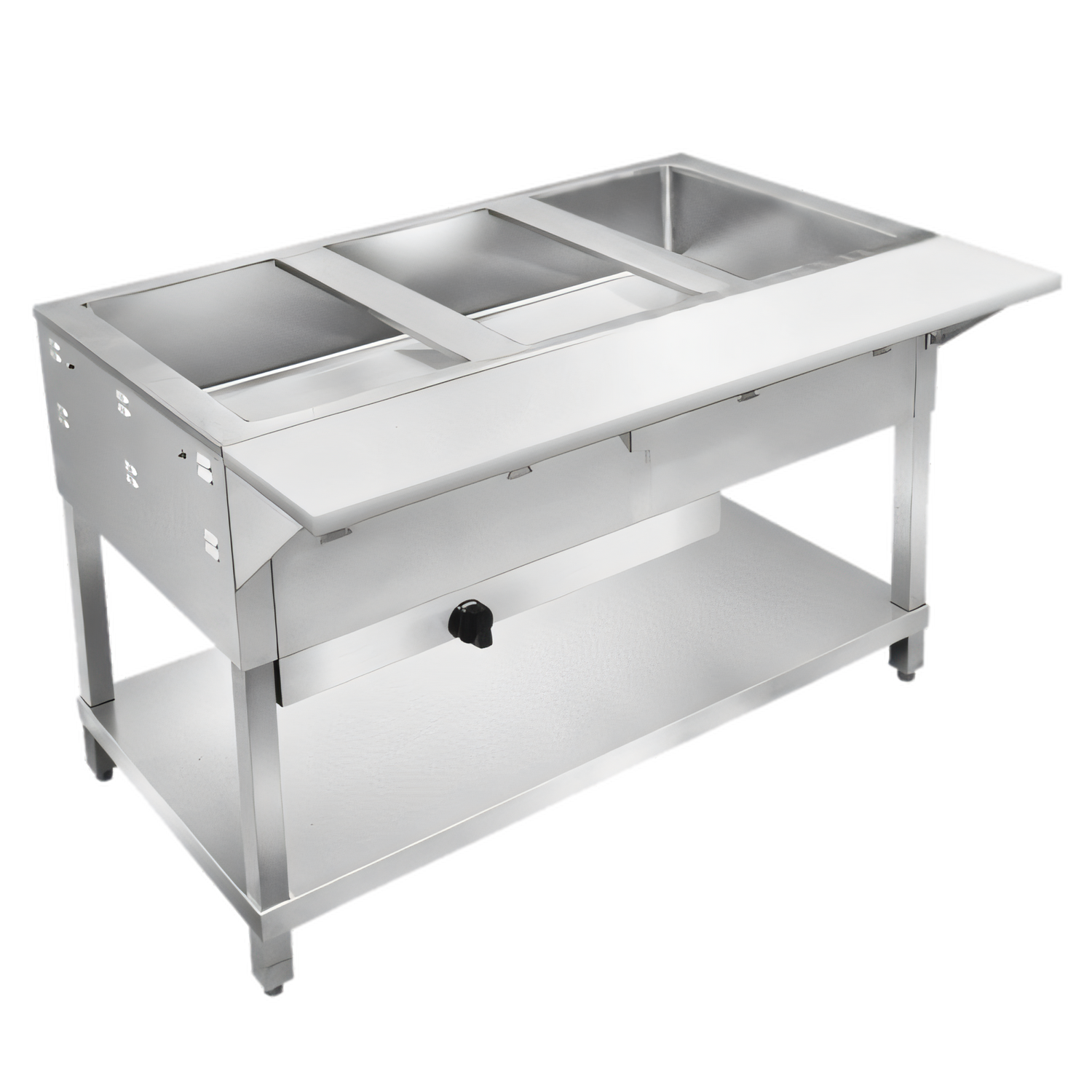 62-1/2" W x 30-5/8" D x 34" H • 20/304 Stainless Steel • ETL-SanitationKeep entrées, sides and sauces at safe, delicious serving temperatures with the rugged WB4H gas steam table from Klinger’s Trading. Built entirely from food-grade 304 stainless steel, this 4-well unit delivers years of trouble-free performance in the busiest cafeteria, buffet or catering kitchen.