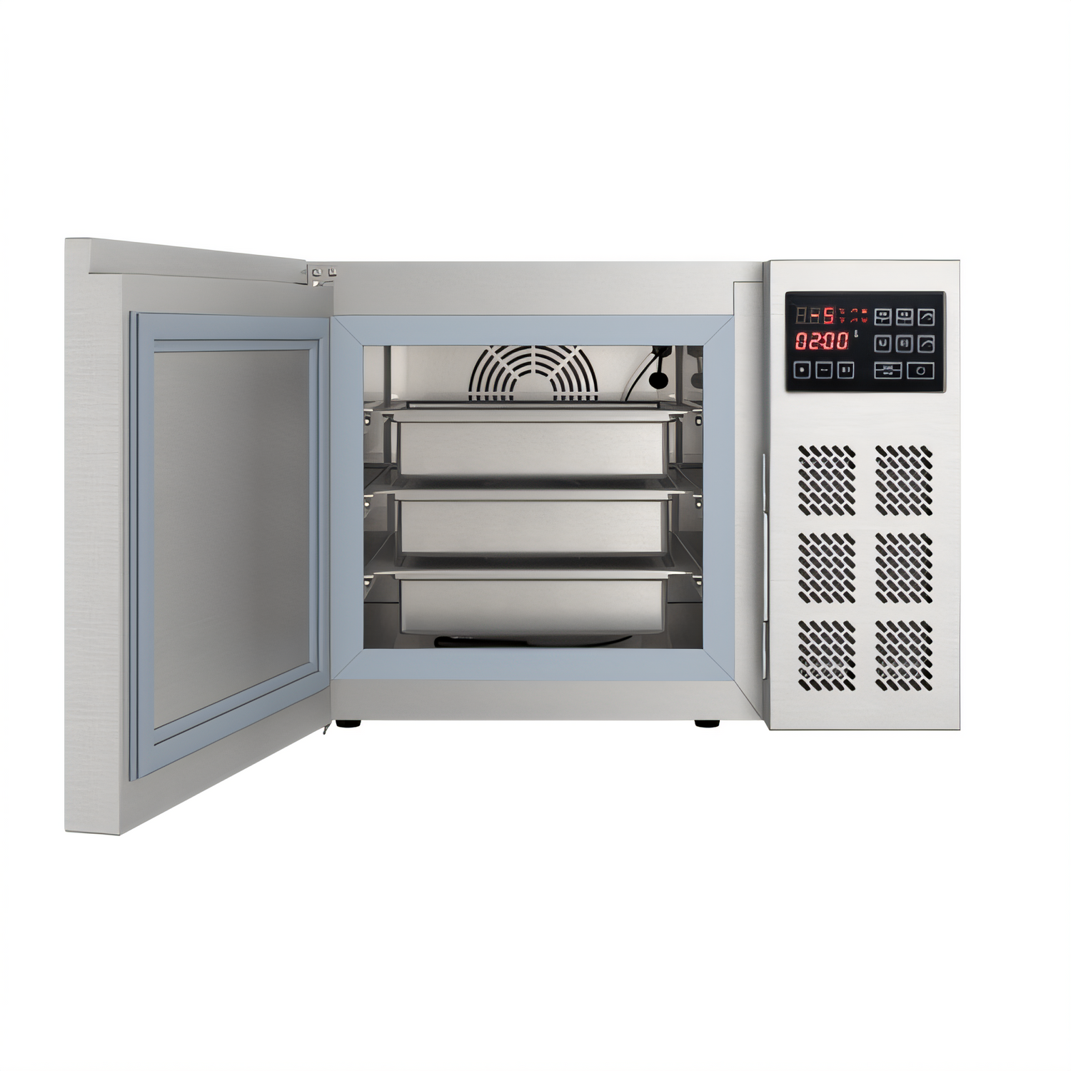 Koolmore KM-CBLC-3 blast chiller/freezer: rapid 194°F→0–37°F cycles, stainless steel, 15 lb chill/8.8 lb freeze, HACCP compliant.