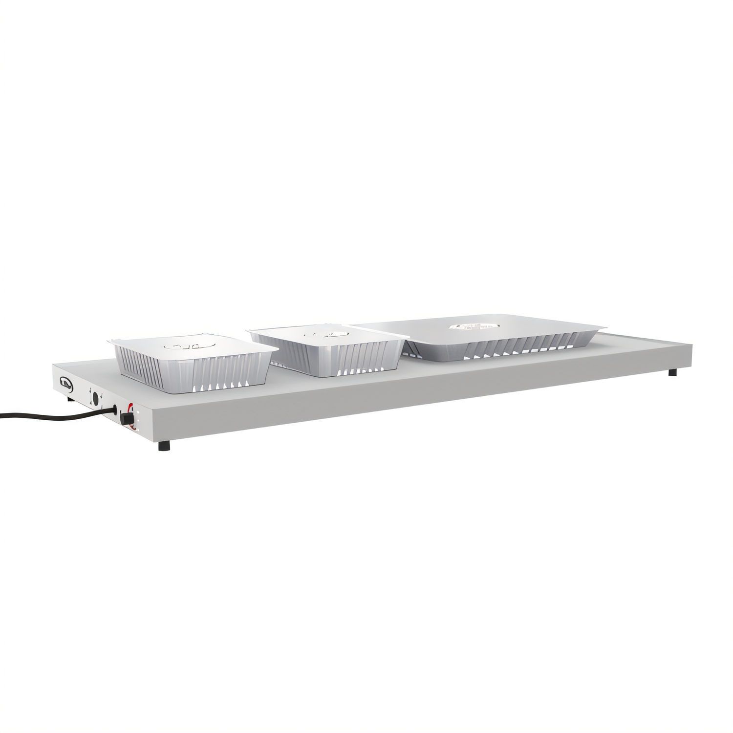 KoolMore Commercial Warming Shelf, 48"W x 20"D x 3"H, marine edge, temperature range 80-212°F, supports upto 55 lbs, adjustable rubber feet, 304 stainless-steel exterior, 4.59ft power cord, NEMA 5-15P, 6.4 amps, 768 watts, 120v/60/1-ph, UL-listed, NSF, Shipping Dimension (20.87" W x 55.12" D x 3.94" H)