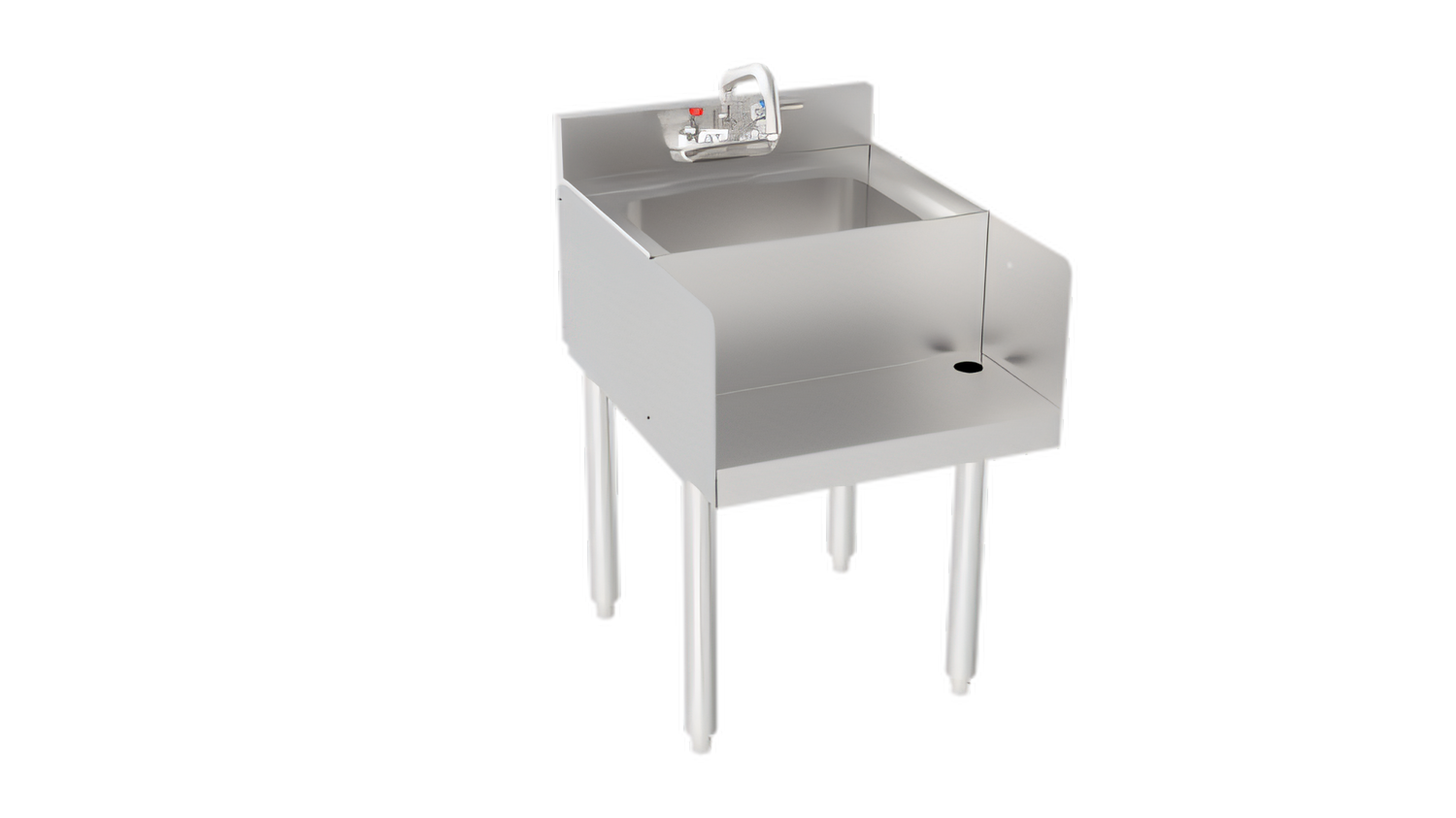Silver Series Blender Dump Sink, 18" W x 22.5" D, 12"D x 14"W x 7"H bowl size, 1-1/2" drain, 3” H backsplash with 4” center wall mount faucet included with quarter turn ceramic valves, Durable stainless steel construction, 1-5/8” tubular legs with gray plastic bullet feet, Pre-drilled rivnuts for easy attachment in the field, NSF