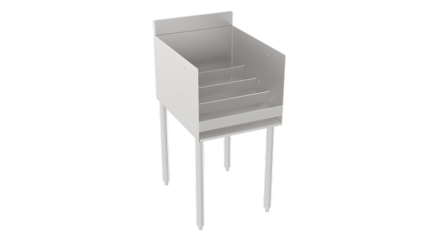 Silver Series 4-Step Raised Liquor Display, 18" W x 22.5" D, 3” H backsplash, Durable stainless steel construction, 1-5/8” tubular legs with gray plastic bullet feet, Pre-drilled rivnuts for easy attachment in the field, NSF